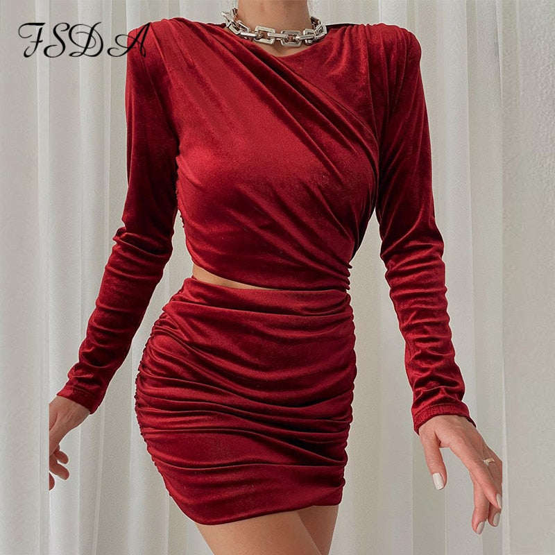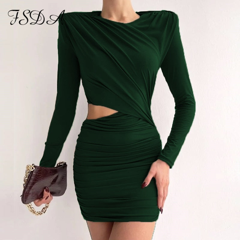 2022 Hollow Out Bodycon Dress Mini Women Brown Autumn Winter Sexy O Neck Long Sleeve Elegant Party Dresses Black Club