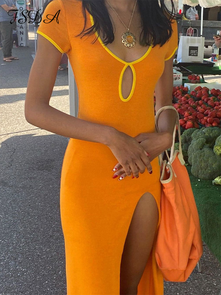 2022 Summer Split Hollow Out Midi Dress Bodycon Short Sleeve Sexy Club Patchwork Y2K Orange Women Dresses Party