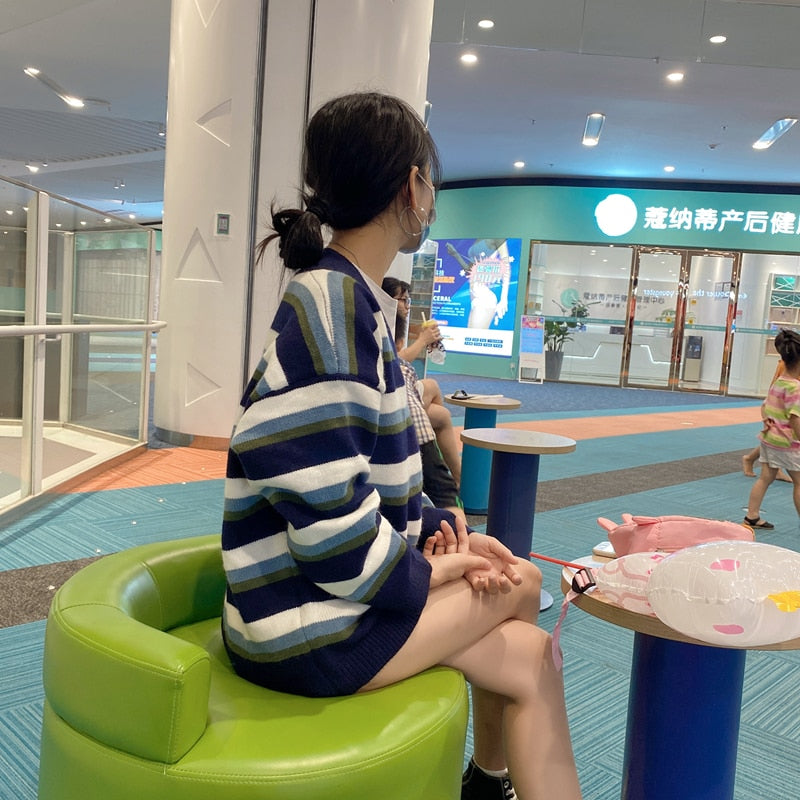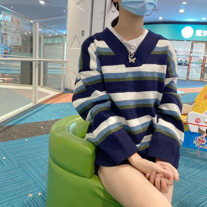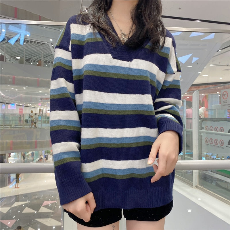 Autumn Chic Stylish Ladies Pullovers Soft Knitted Ins Harajuku Jumper V-Neck Knitted Sweaters Women Loose Striped Tops