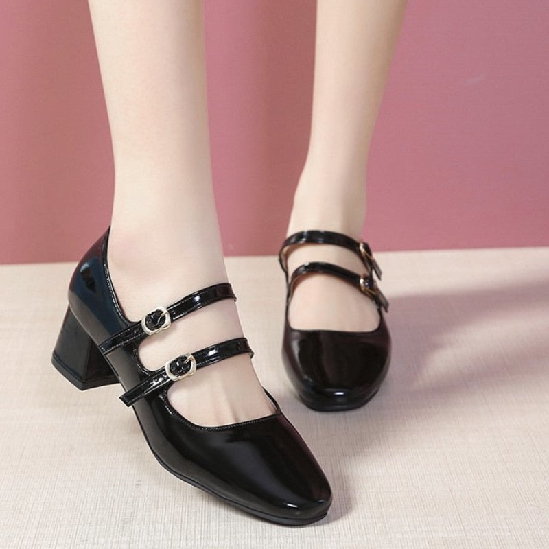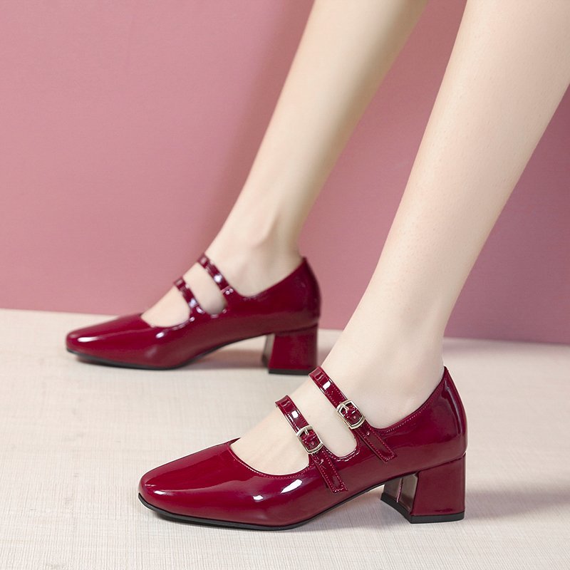 Back To School 2022 Spring Autumn Women Double Buckle Mary Janes Shoes Patent Leather Dress Shoes High Heels Pumps Retro Ladies Shoe Black Red