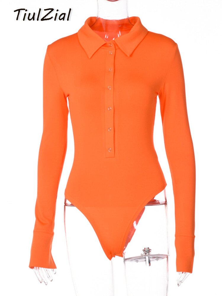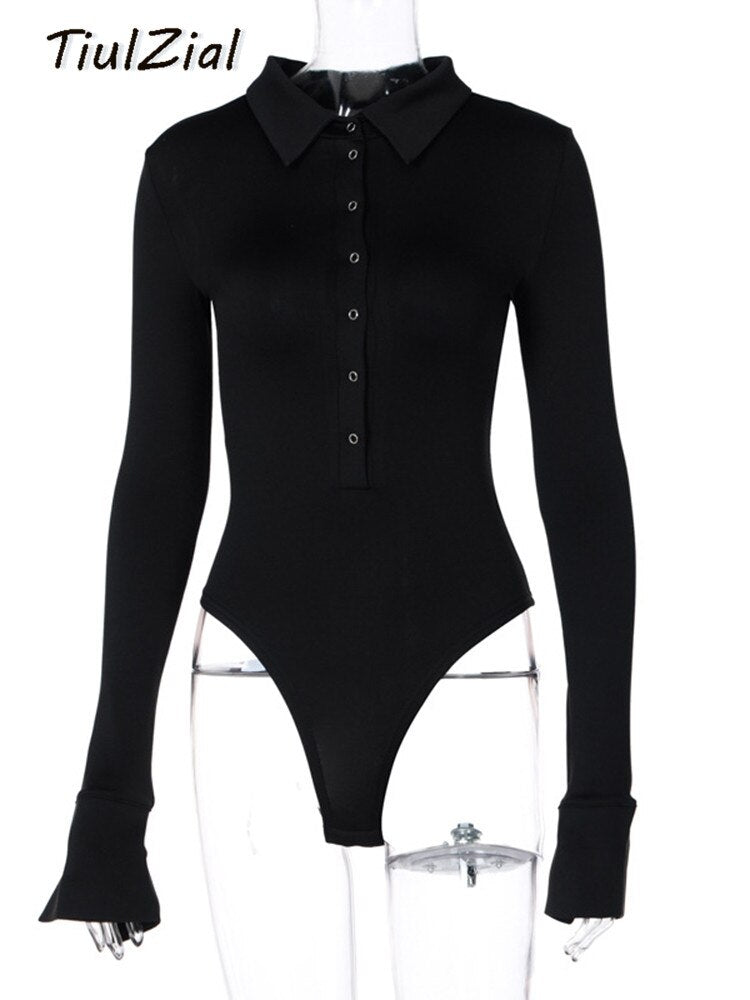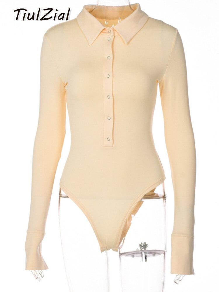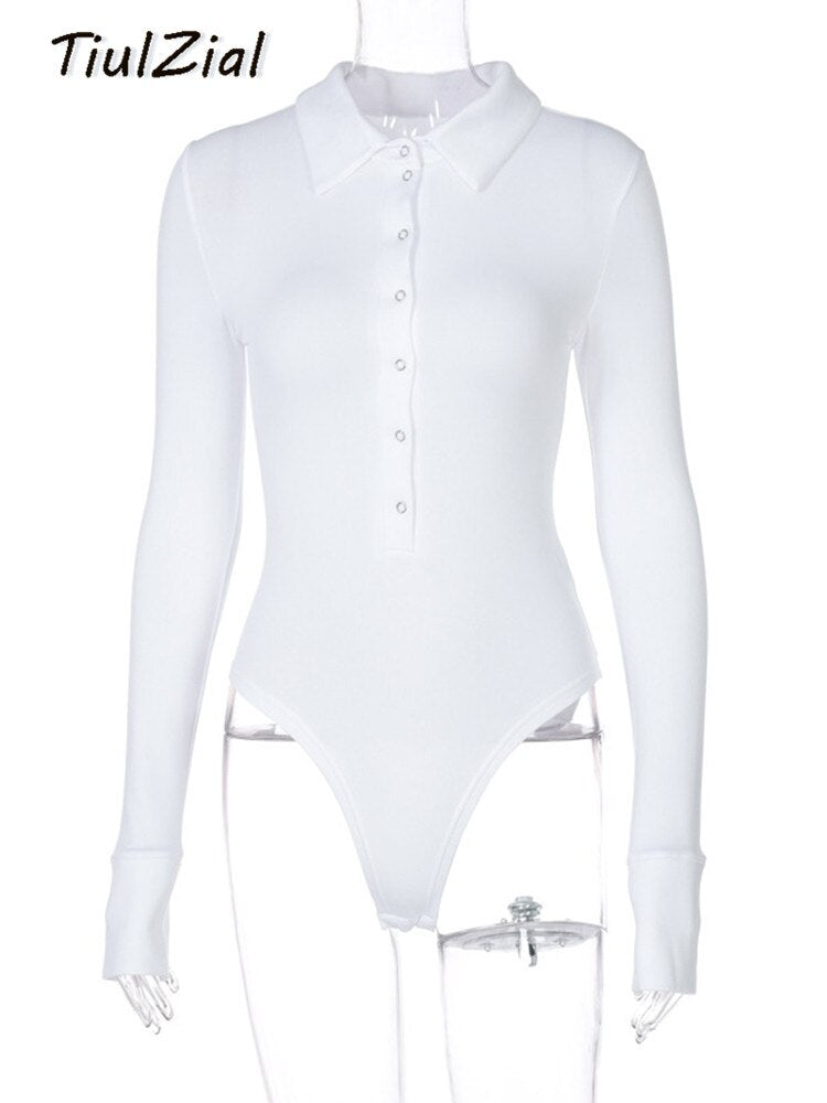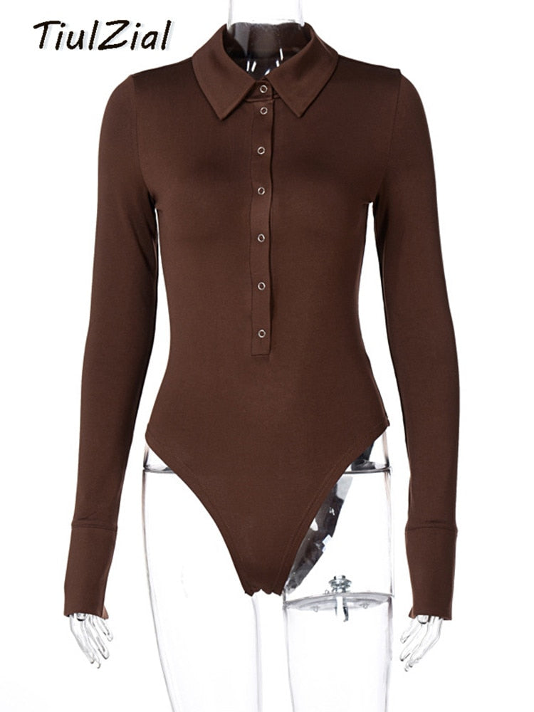TiulZial Button Autumn Winter Long Sleeve Bodysuit Women Turn Down Casual Bodysuit For Woman Body Female Black White Brown Tops