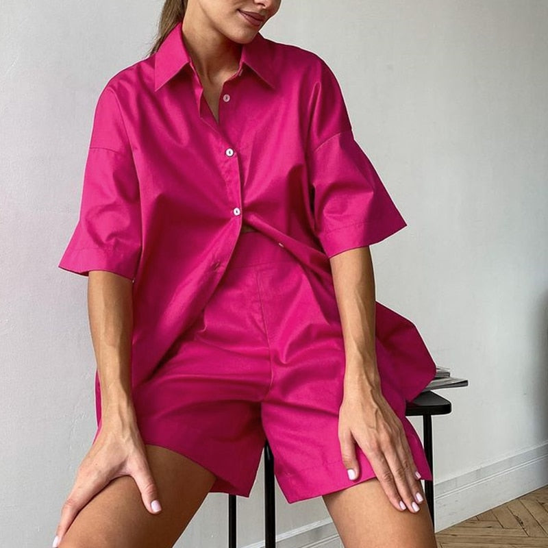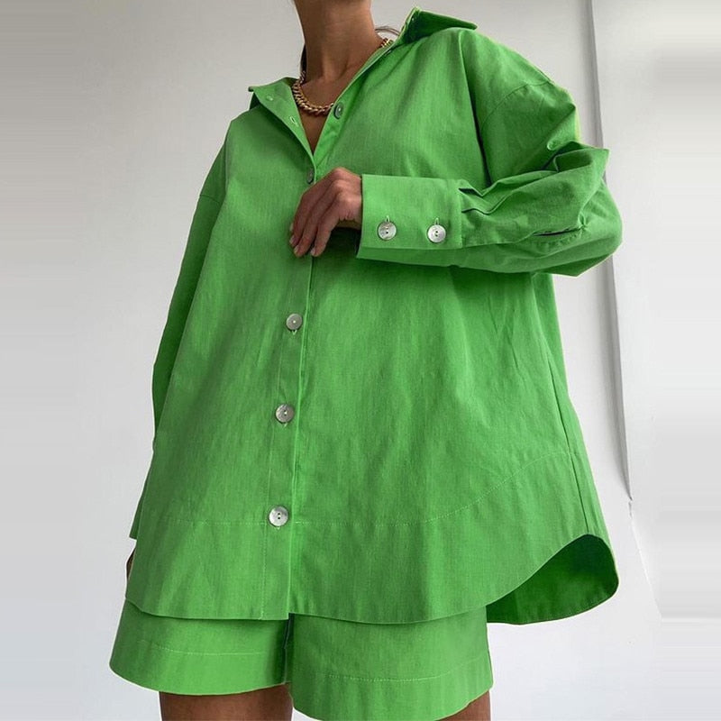 Casual Women Short Set Tracksuit Loungewear Two Piece Women Outfits Oversized Long Shirt And High Waist Shorts Green