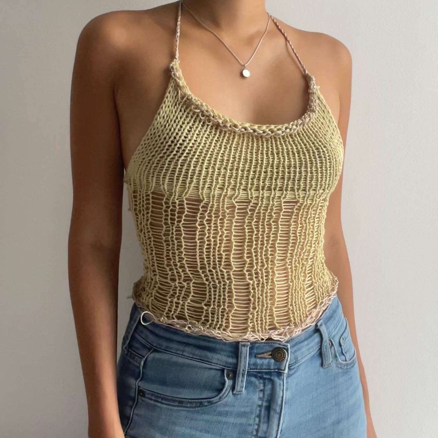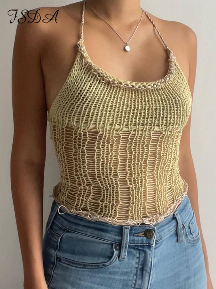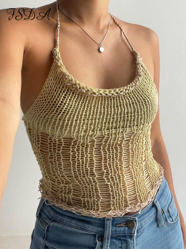 Knitted Halter Neck Y2K Crop Top Backless Women Green Casual Spaghetti Strap 2022 Summer Tank Tops Sexy Sleeveless Cami