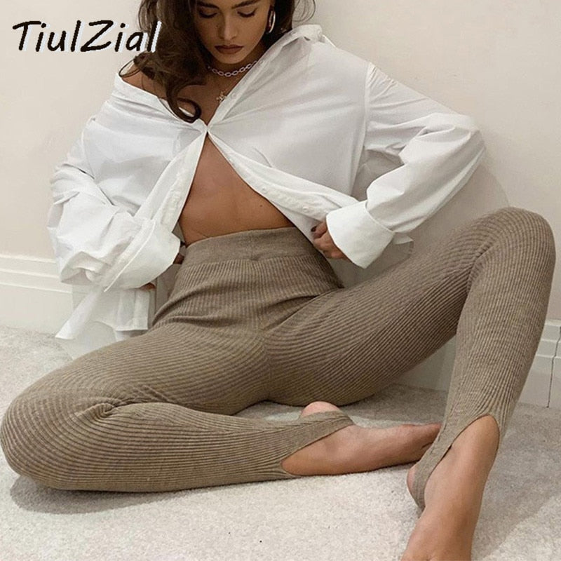 TiulZial Ribbed Knitt Skinny Stretch Leggings Women Autumn Winter Fashion Elastic High Waist Leggings Outfit Stirrup Leggings