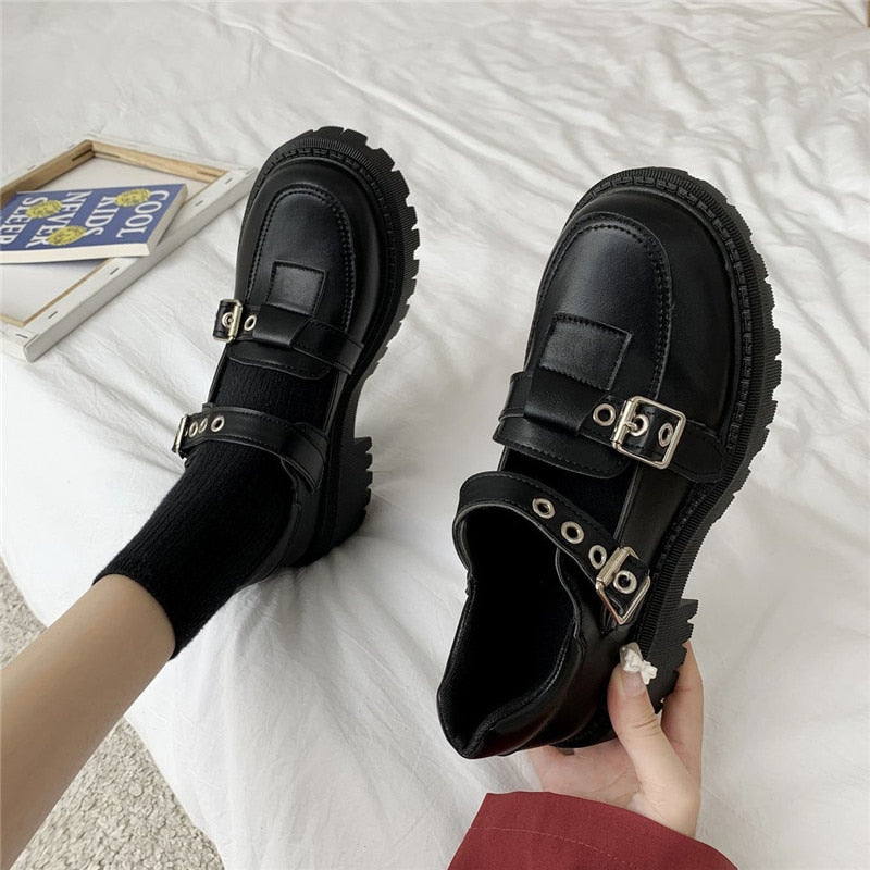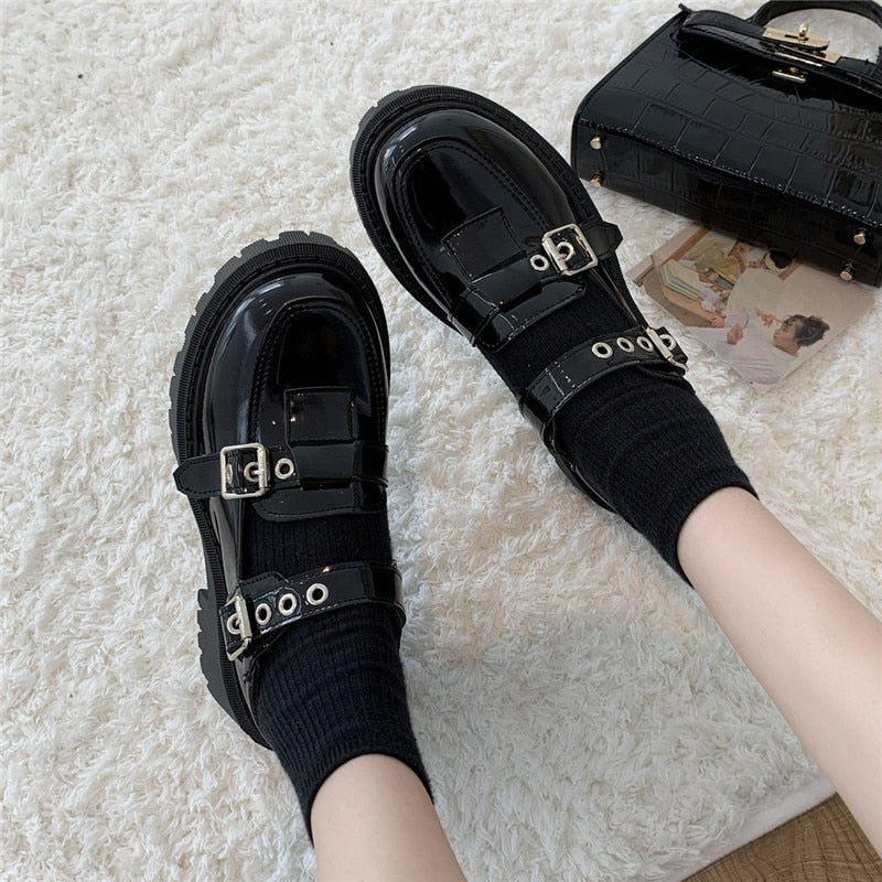 Lolita Shoes Harajuku Buckle Mary Janes Shoes Women Cross-tied Platform Shoes Patent Leather Girls Shoes Rivet Casual Shoes