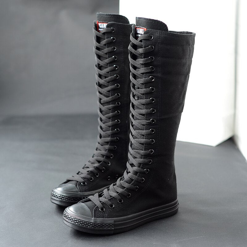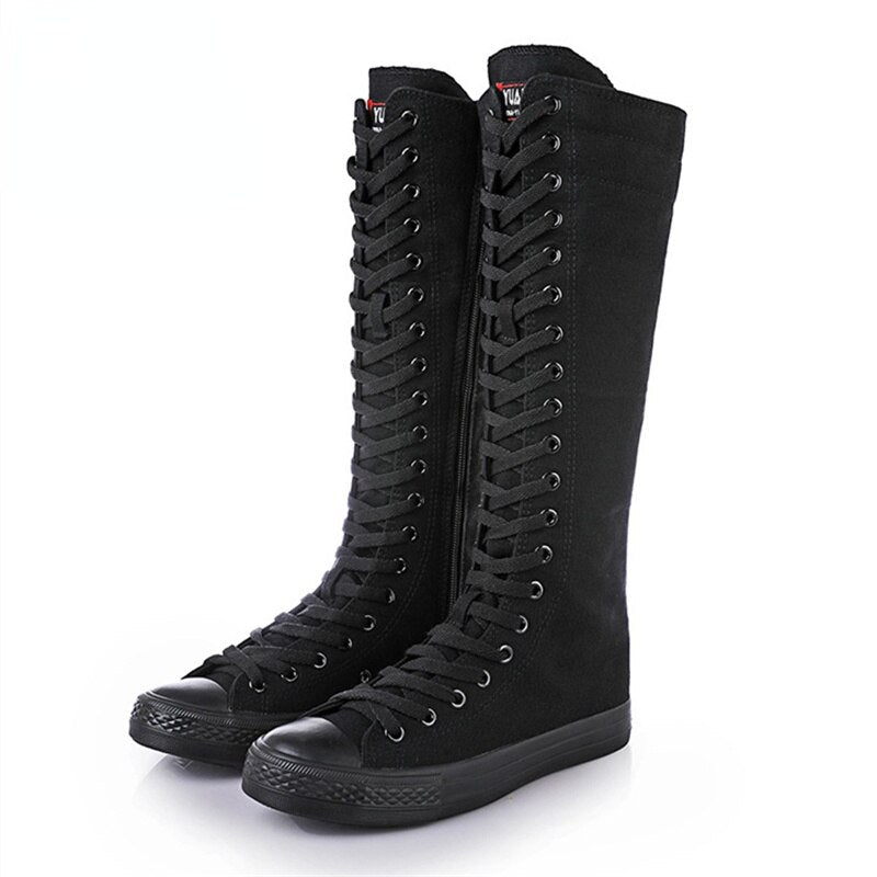 Miaoguan 2021 Spring Autumn Women Canvas Casual Shoes Long Knee High Boots Lace-Up Zipper Comfortable Flat Sneakers Small Size