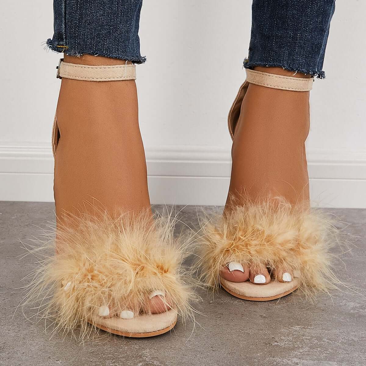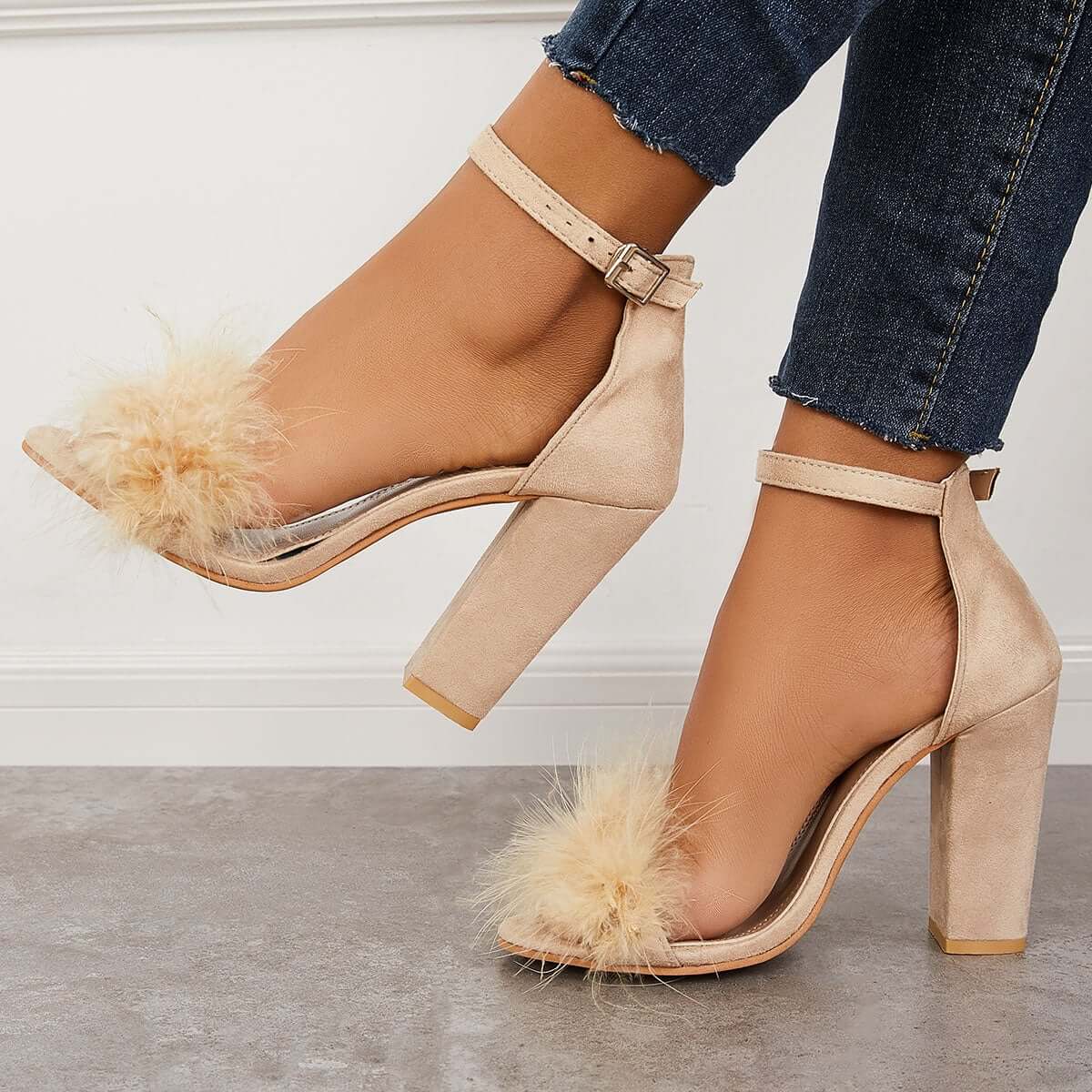 Fluffy Chunky Block High Heel Sandals Ankle Strap Dress Pumps