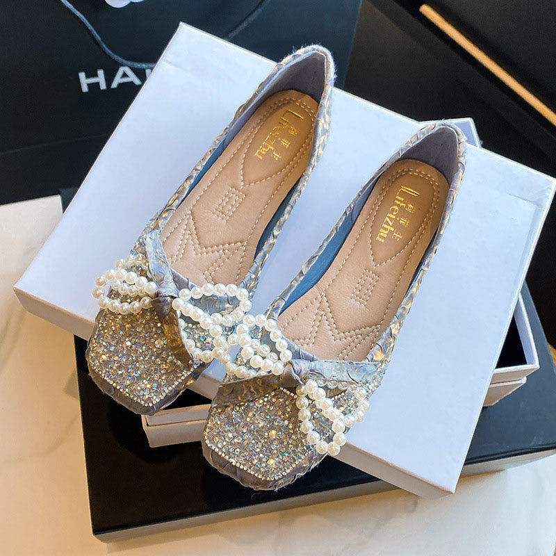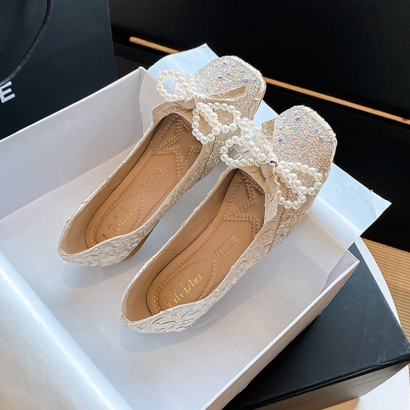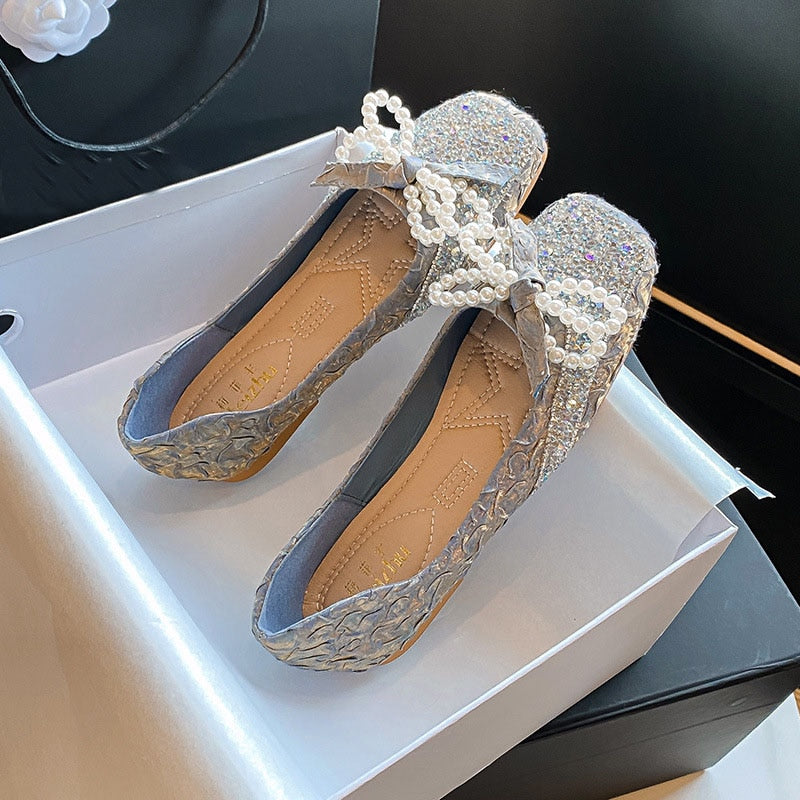 pearl strings bow flat shoes women glitter lolita shoes pleated slik square toe slip on loafers women espadrilles big size 43