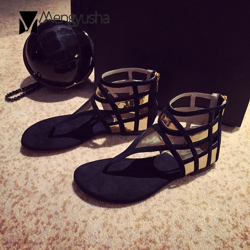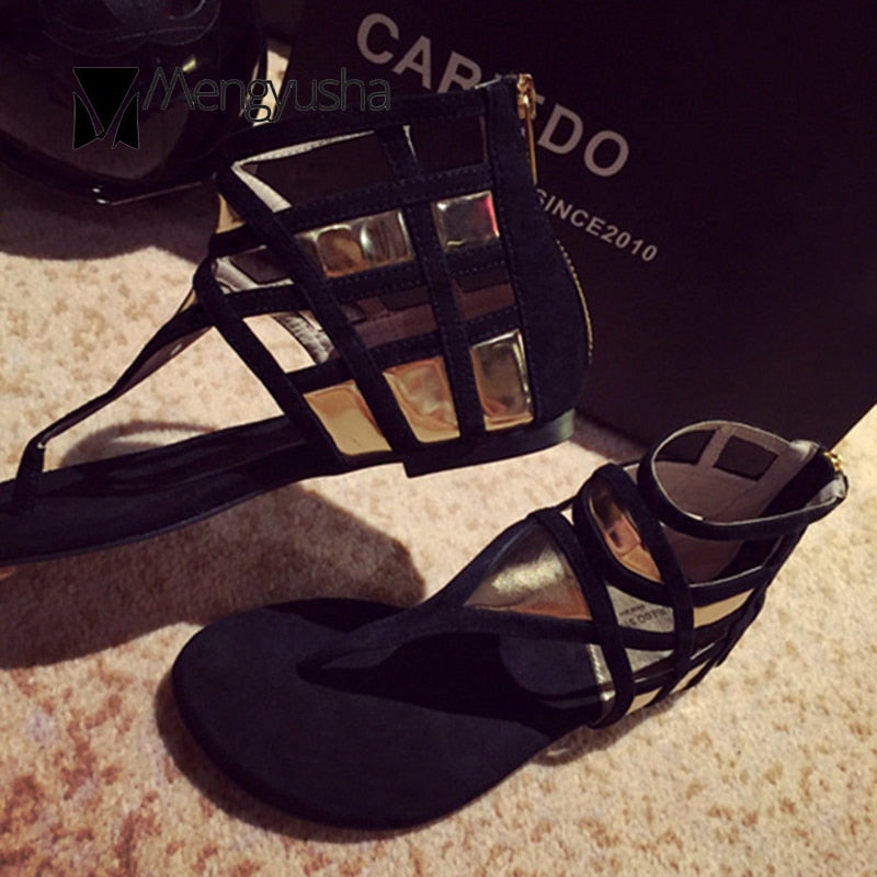 Plus size 42 suede hollow out patchwork women sandals clip toe back zipper flats sandalias roman sexy black high-top women shoes