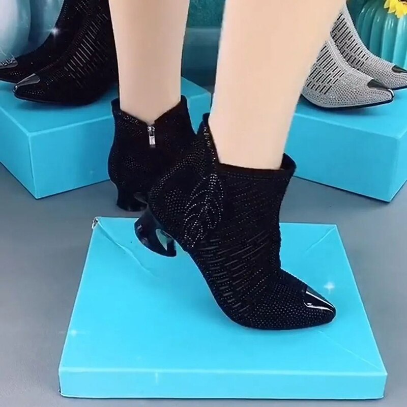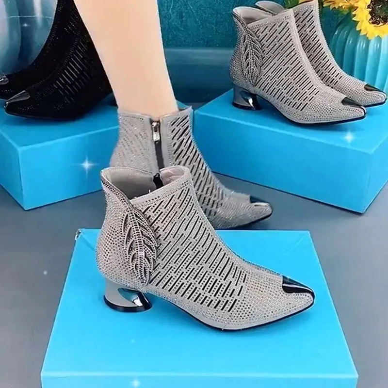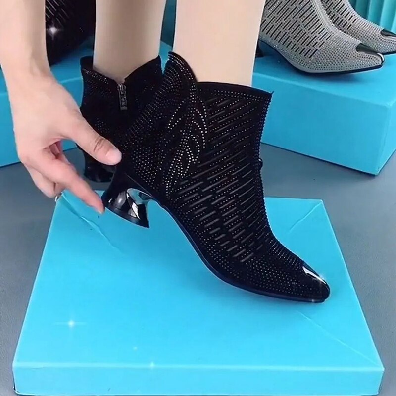 Qengg New Sexy All-match Rhinestone Fashion Shoes Women Thick-heeled Mid-heel Pointed Toe Side Zipper Sandals Women's
