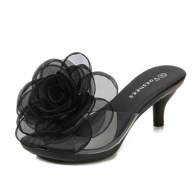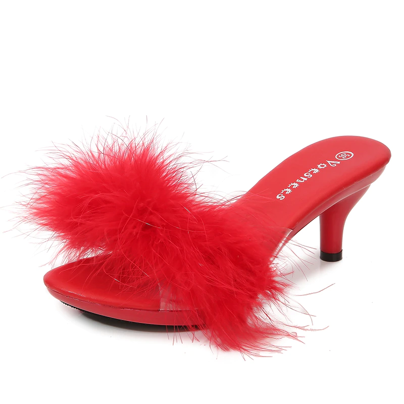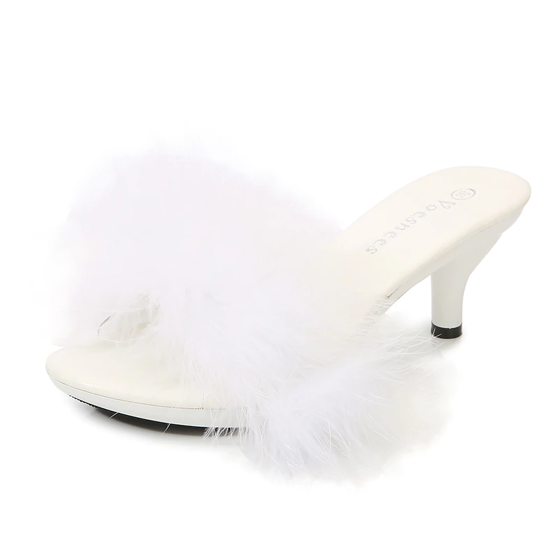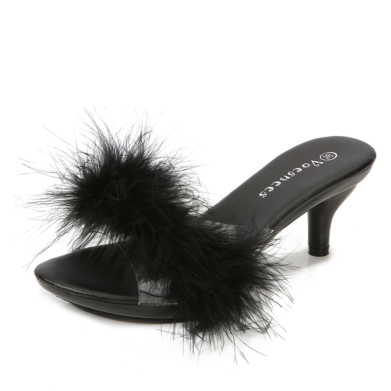 Qengg Solid Color Feather Fairy Slippers Summer Transparent Sandals Thin High Heels Sexy Fur Crystal 6cm Low Heel Derss Women Shoes