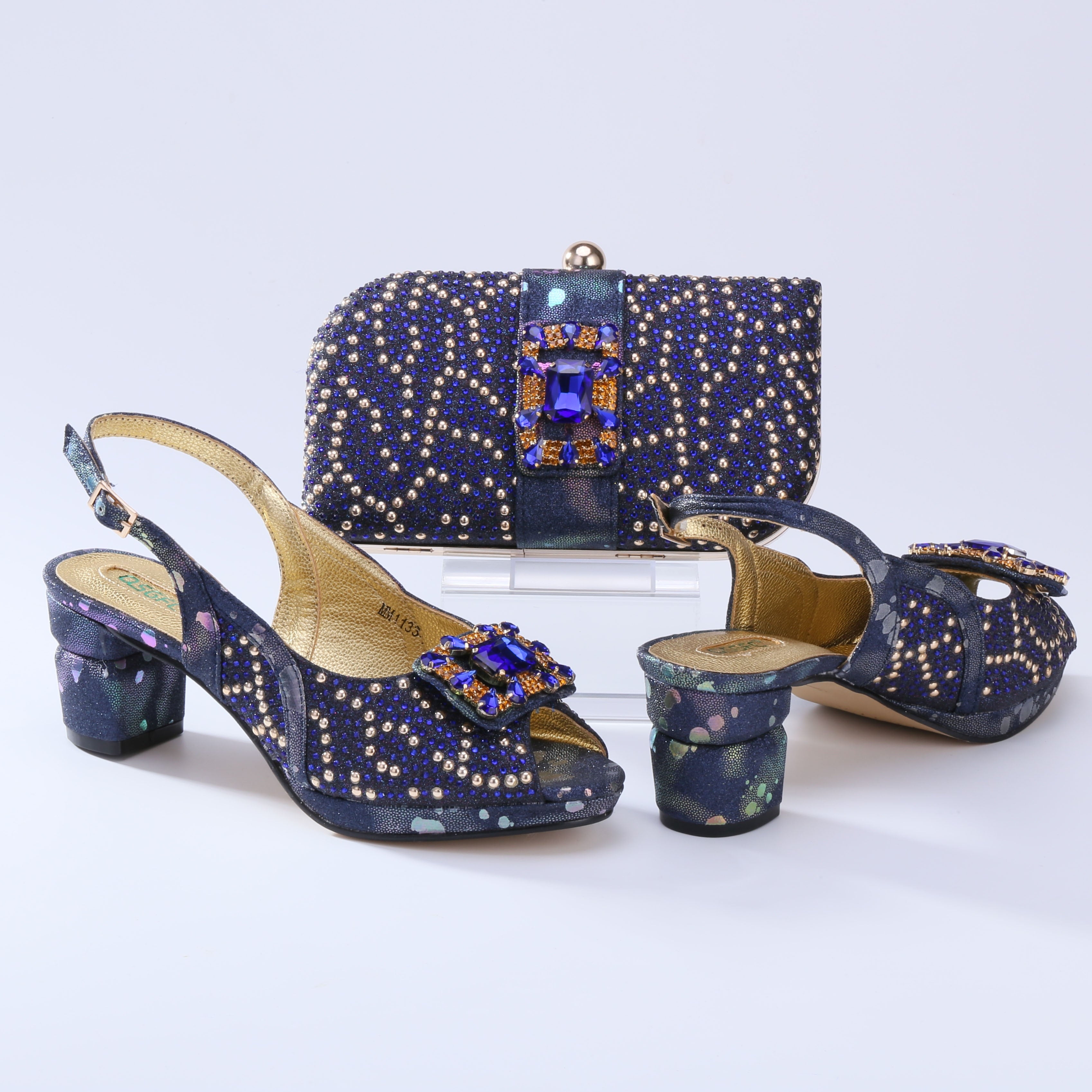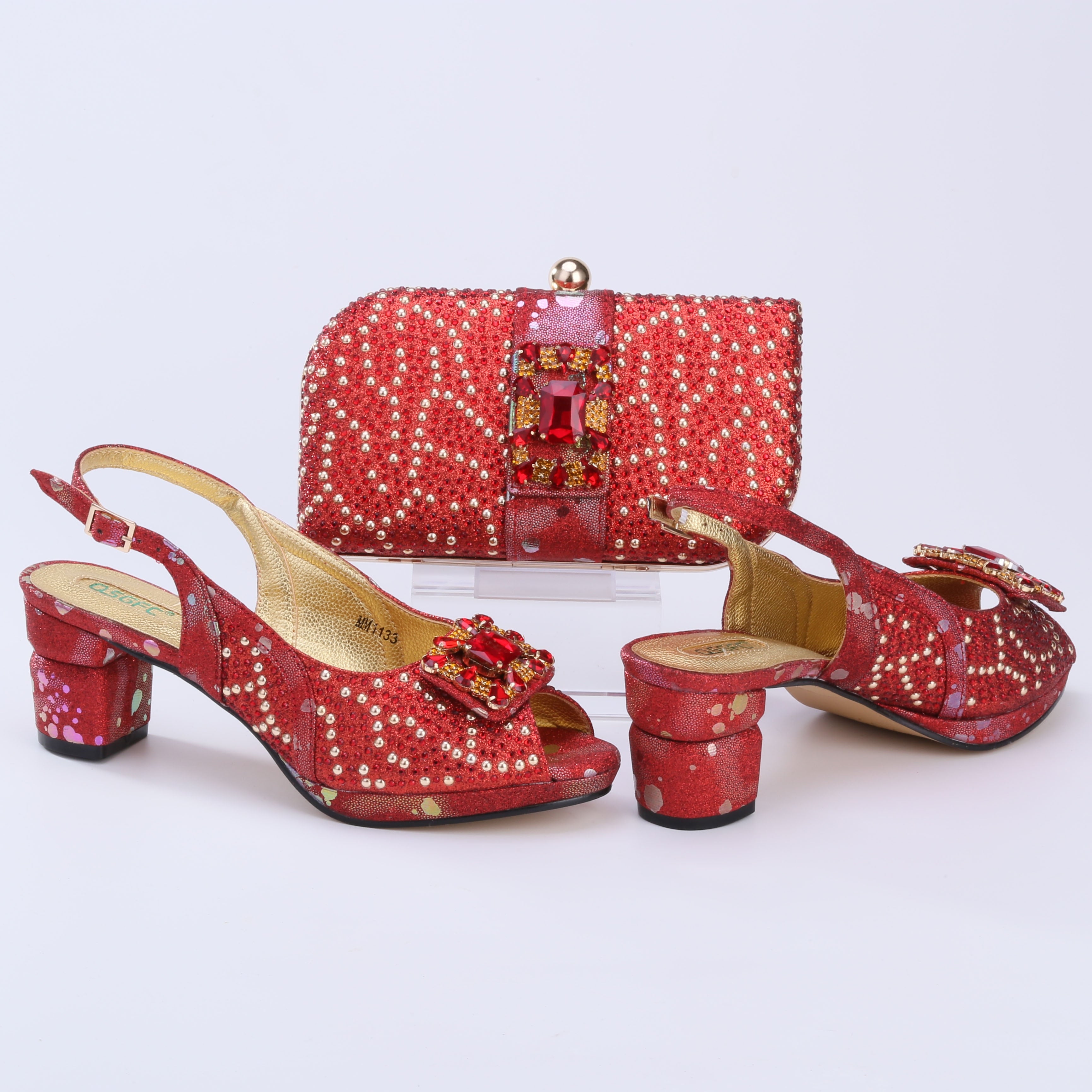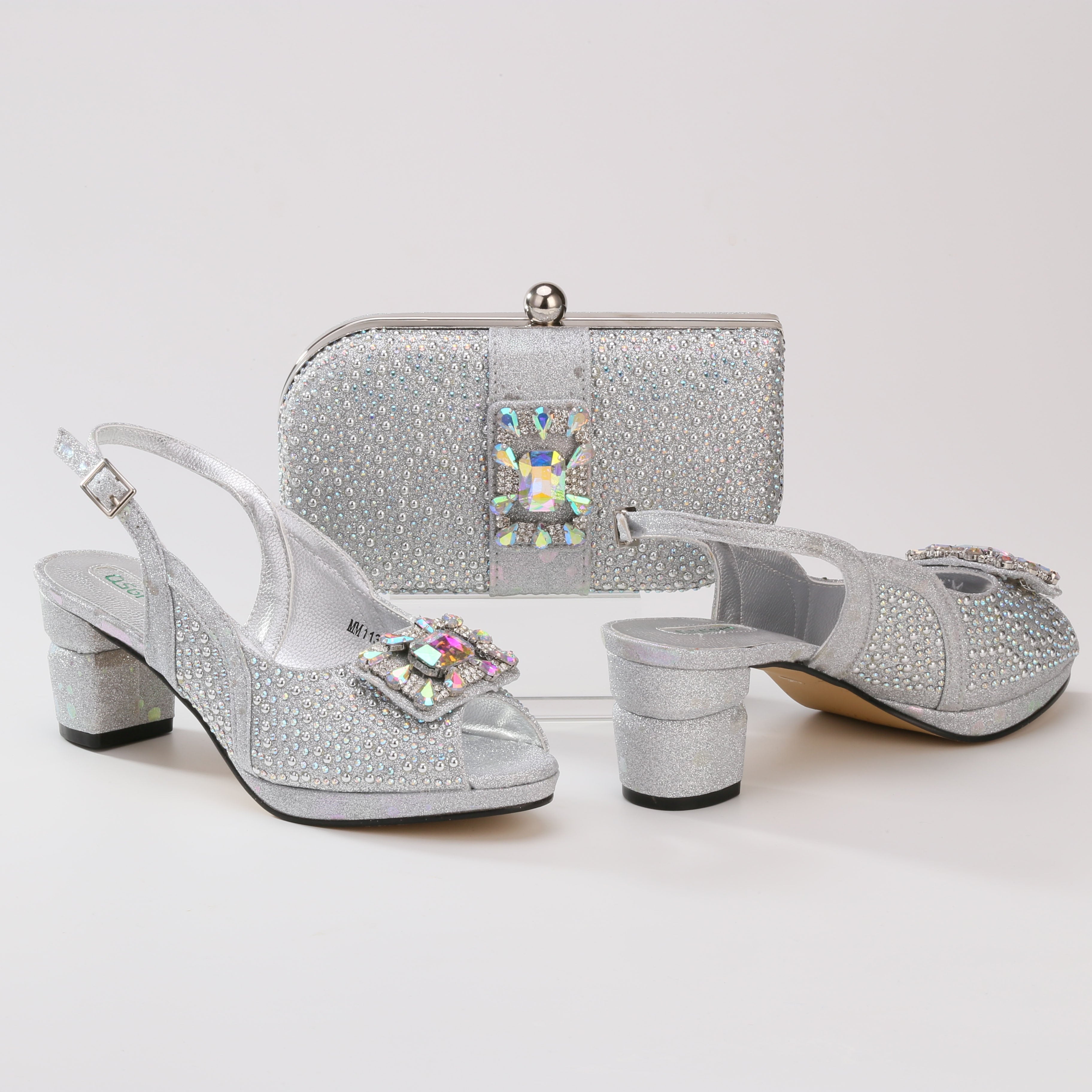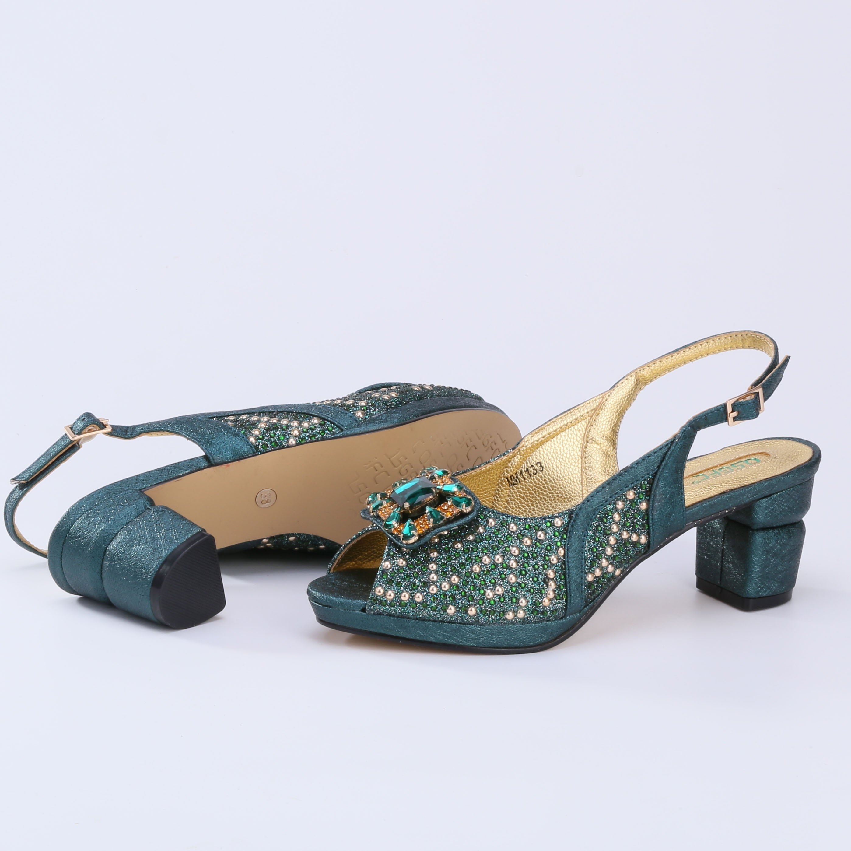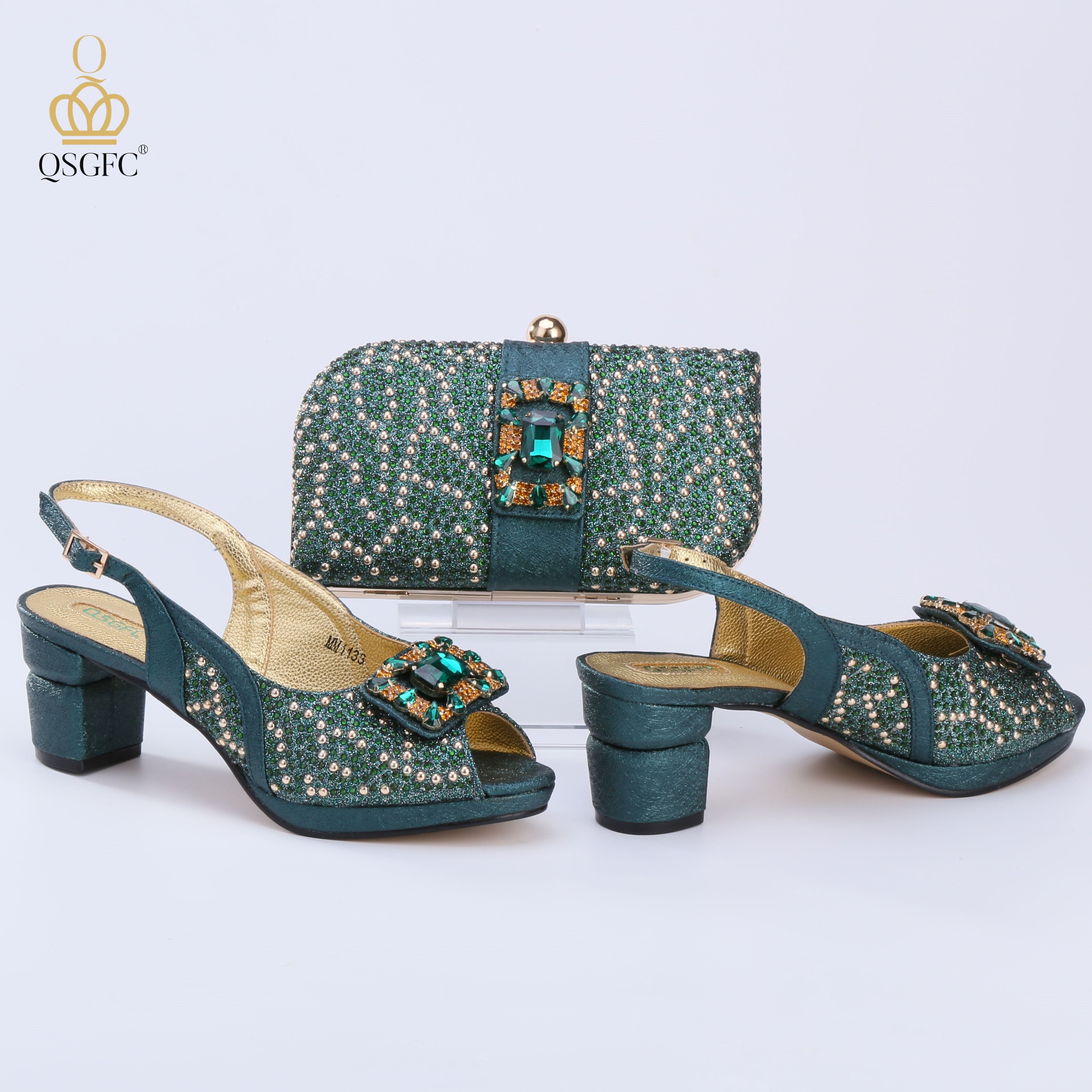 QSGFC 2022 Newest Fashion Noble Green Color Party Wedding Ladies Shoes and Bag Set  Decorated With Rhinestone