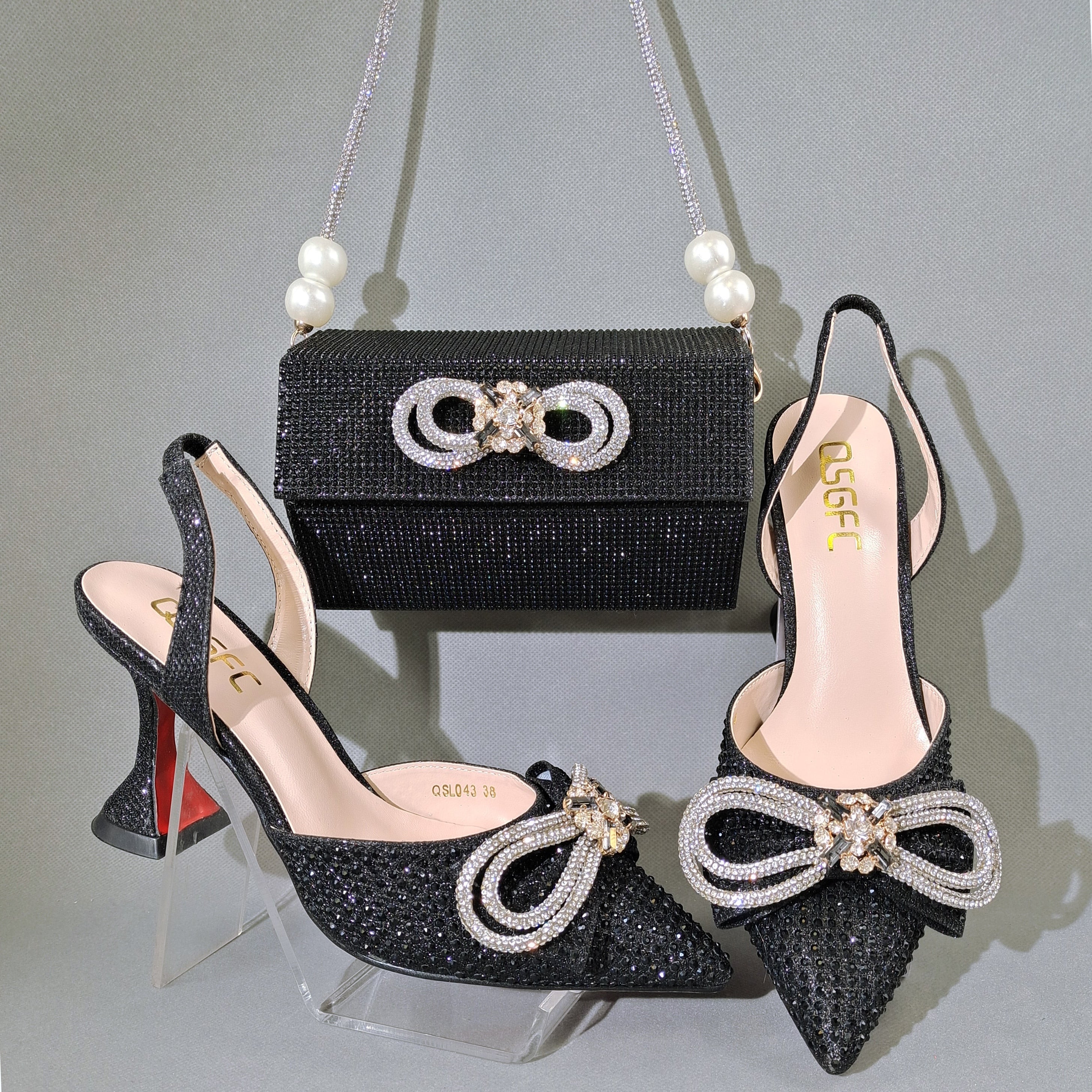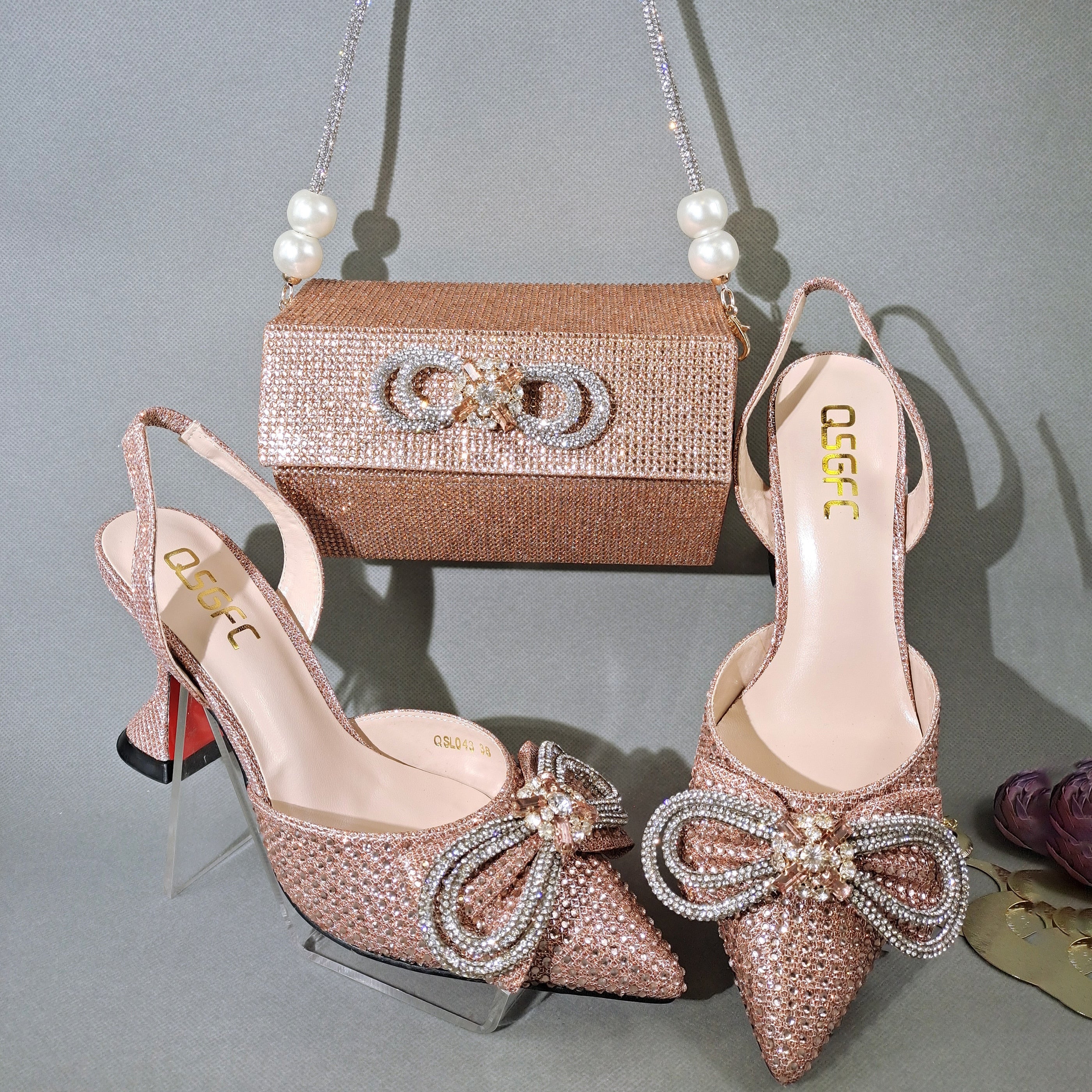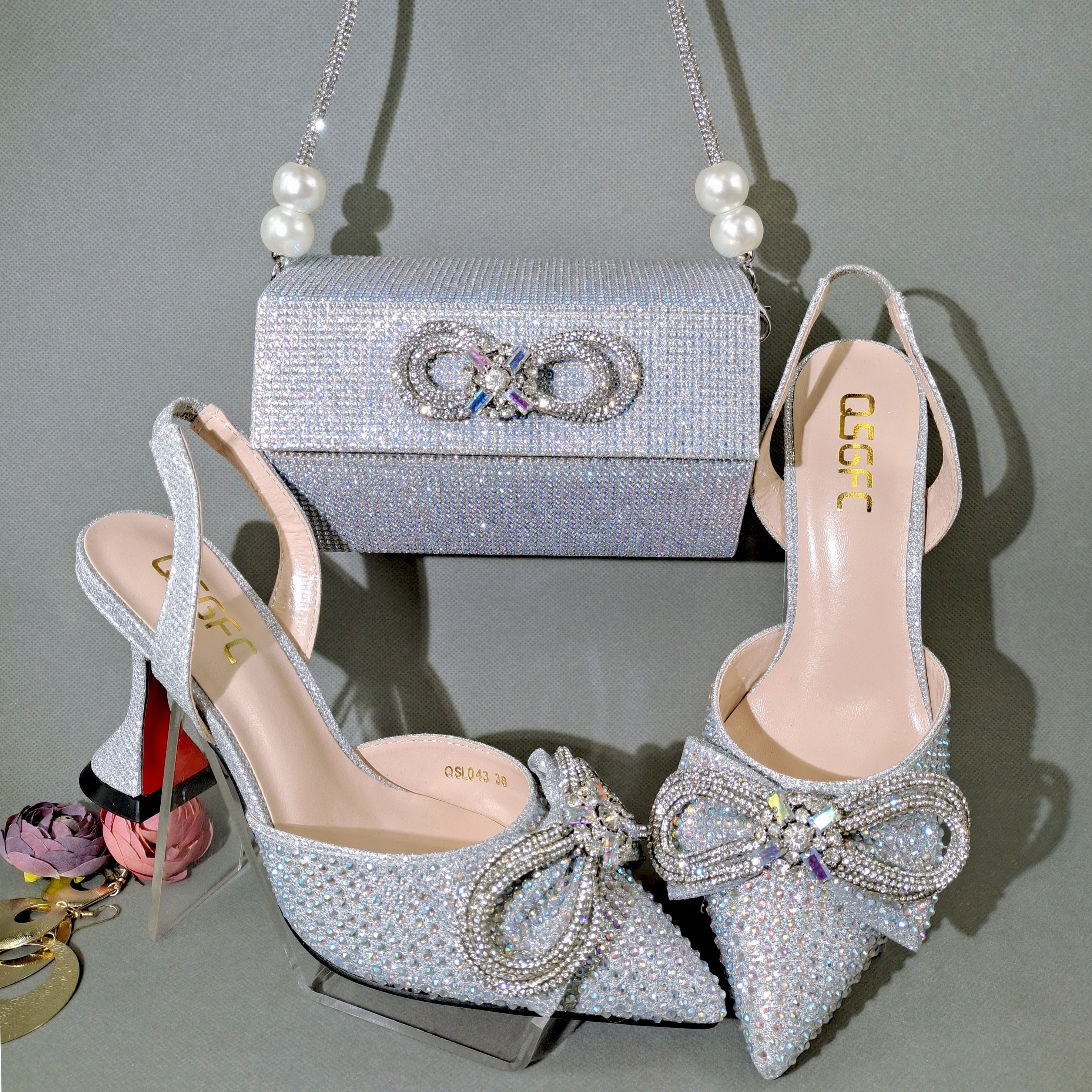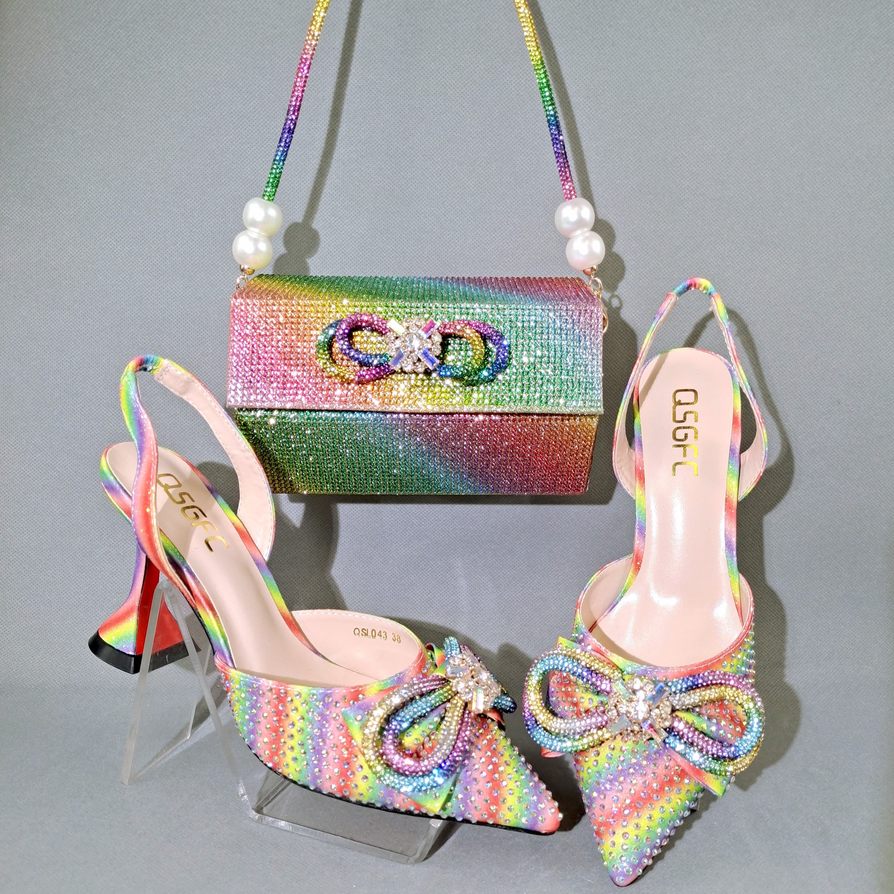 QSGFC 2022 Popular pointed Full of diamonds and shiny shoes with bags, banquet shoes and bags, and friends party shoes with bags