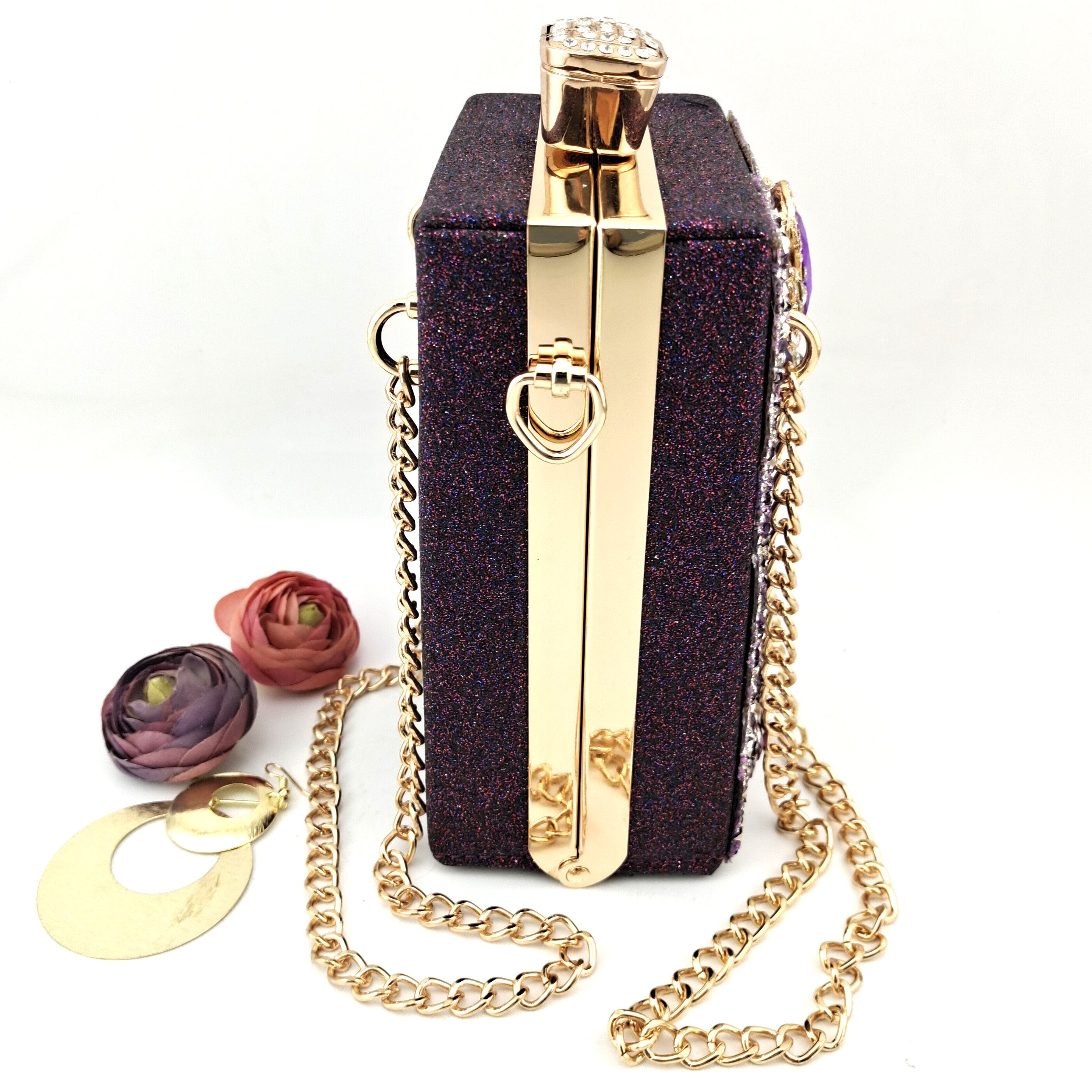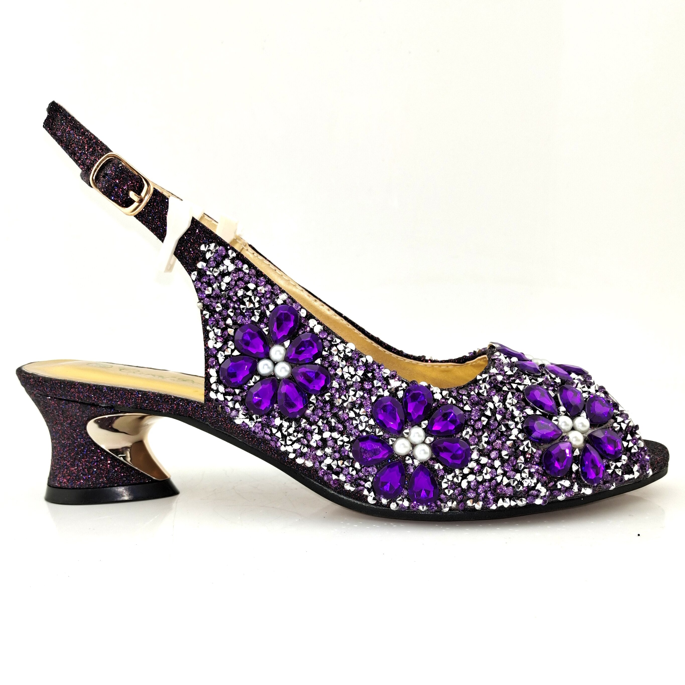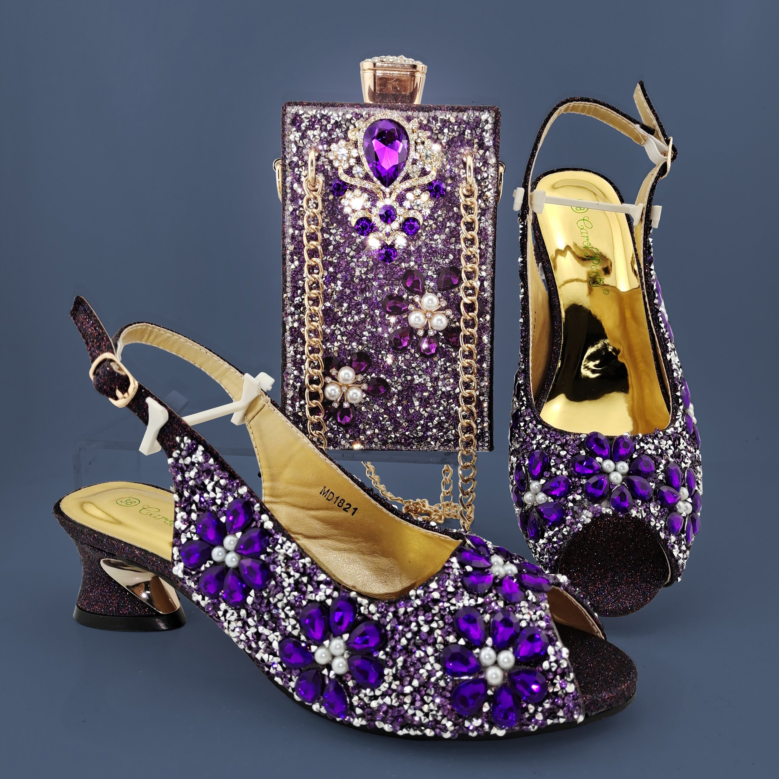 QSGFC 2022 Purple  Color Shiny Retro Alloy Mosaic Rhinestone Accessories Ladies Shoes and Bag Set for Party Wedding