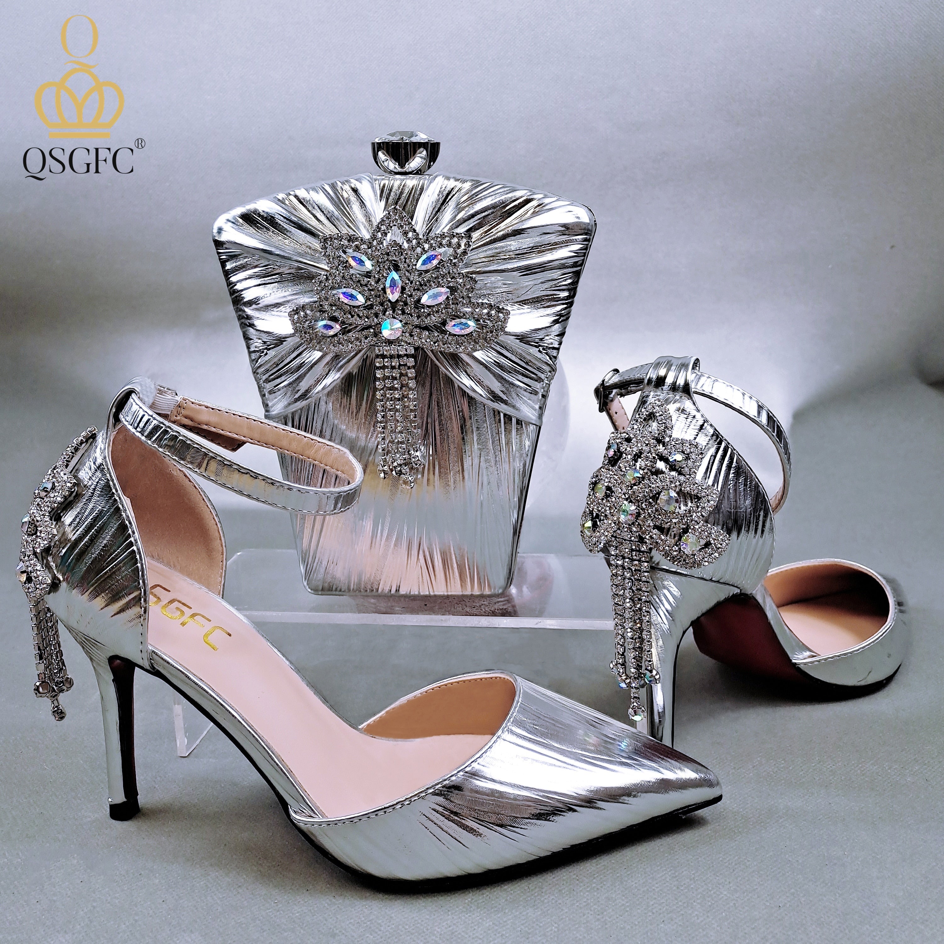 QSGFC New Arrive Fashionable African Silver Party Shoes and Matching Bag Set Sexy High Heels With Women For Royal Wedding
