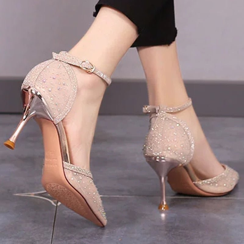 Sexy Ankle Strap Pumps For Women 2022 Summer Black Mesh Stiletto High Heels Shoes Woman Pointed Toe Crystal Party Shoes