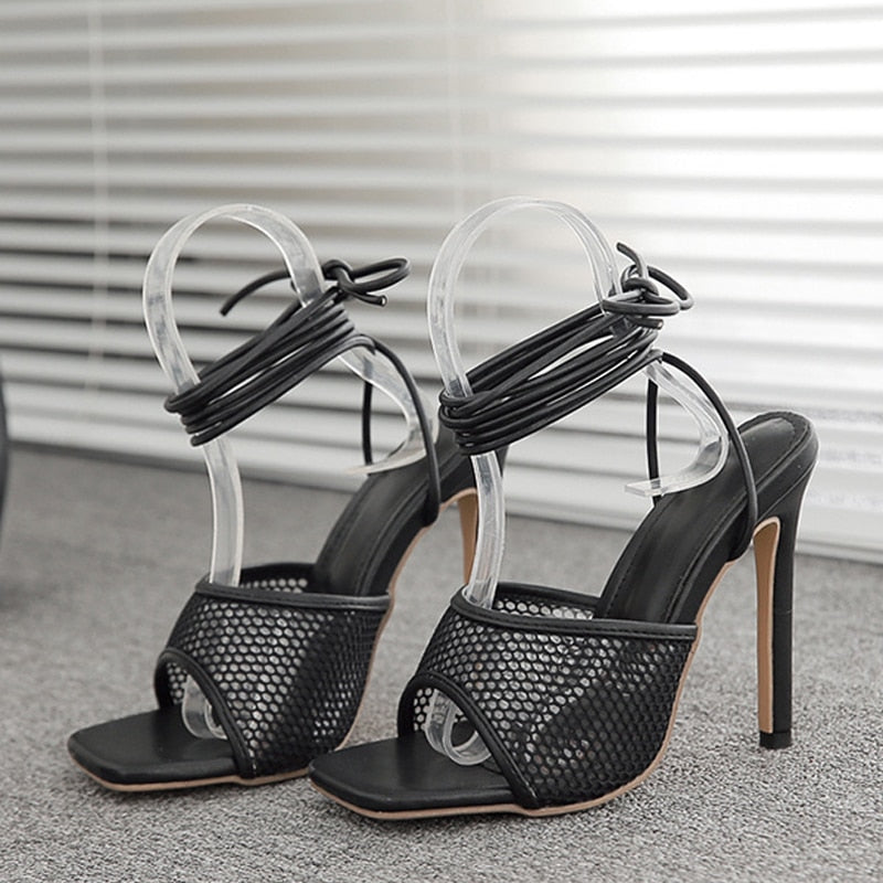 Sexy Purple Orange Mesh Women Sandals Summer Fashion Square Open Toe Ankle Cross Lace-Up Heels Stiletto Hollow Dress Shoes Pumps