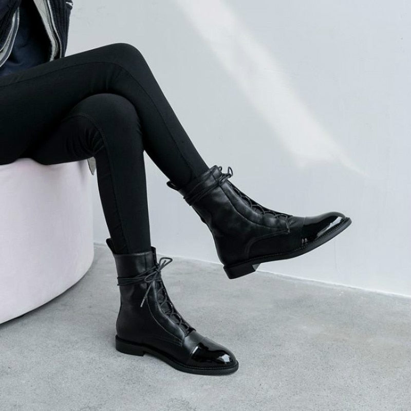 South Korea 100 British comfortable tie leather tip low heel Martin boot woman flat bottom short boot