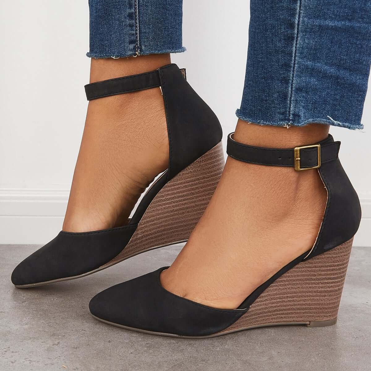 Classical comfortable wedge sandals with closed pointed toe and adjustble ankle strap style, give your feet much room while walking. For wide feet, may get 1/2 size bigger than normal to let you more comfortable.