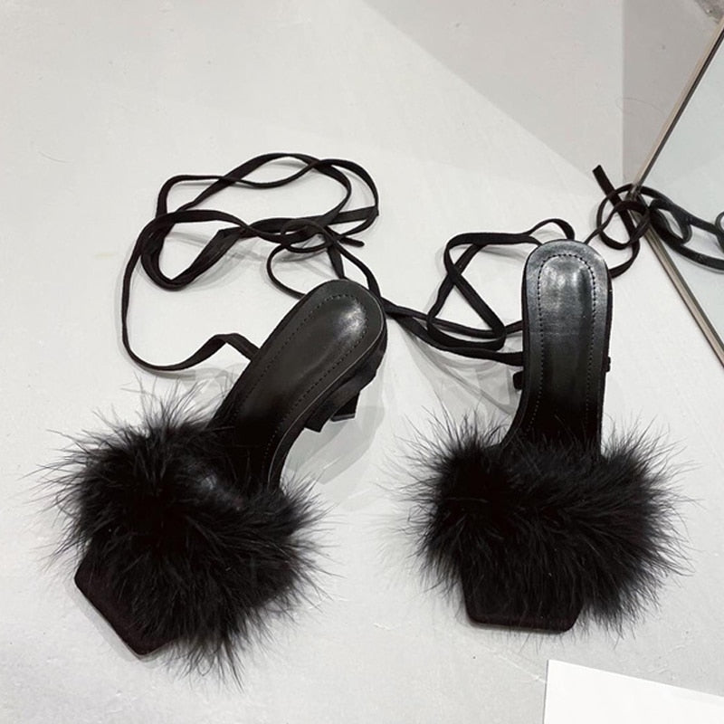 Summer Green Shoes Sandals Fashion Furry Cross-Tied Women Pumps 2022 Sexy Lace-up Party Dress Ladies 11CM Strange High Heels