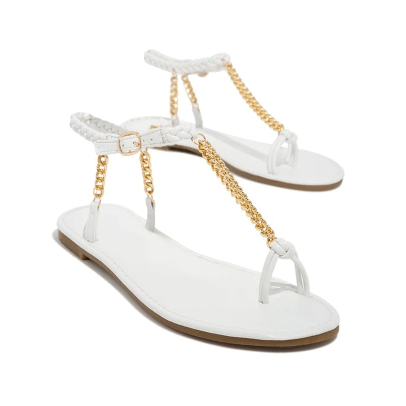 Summer Sexy Luxury Women Sandals Chain Solid Leather Ankle Buckle Strap Flat Heel Ring Toe Flip Flops Fashion Ladies Shoes 2021