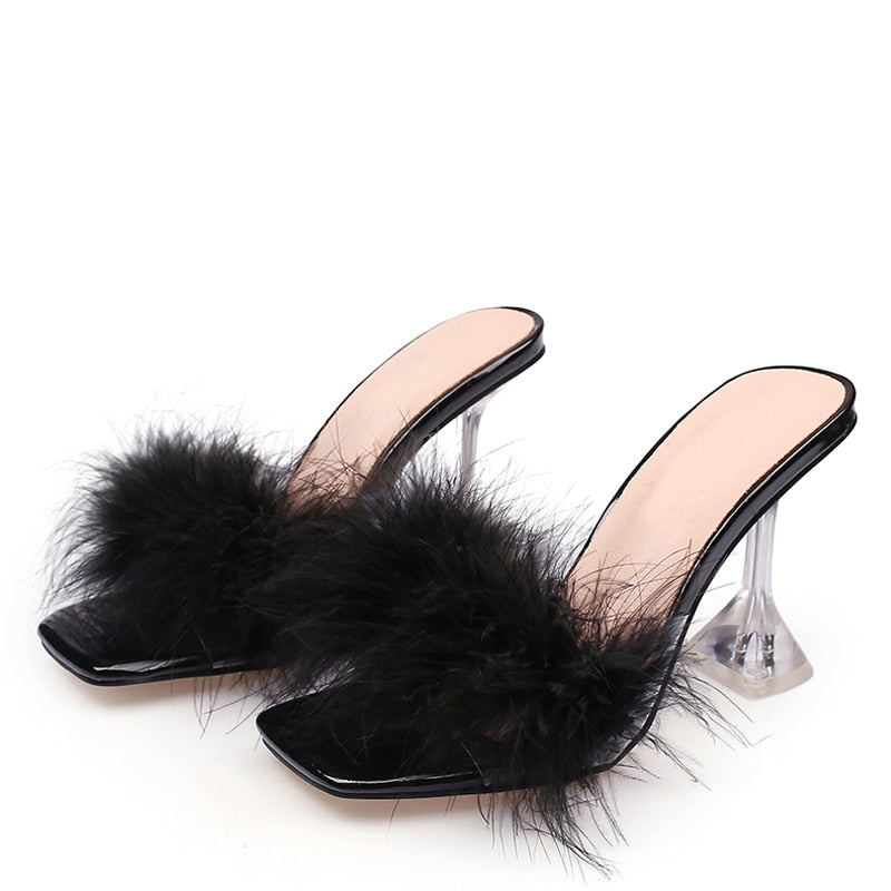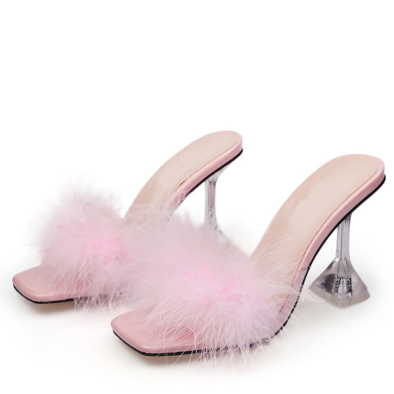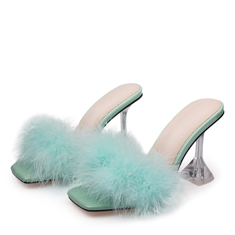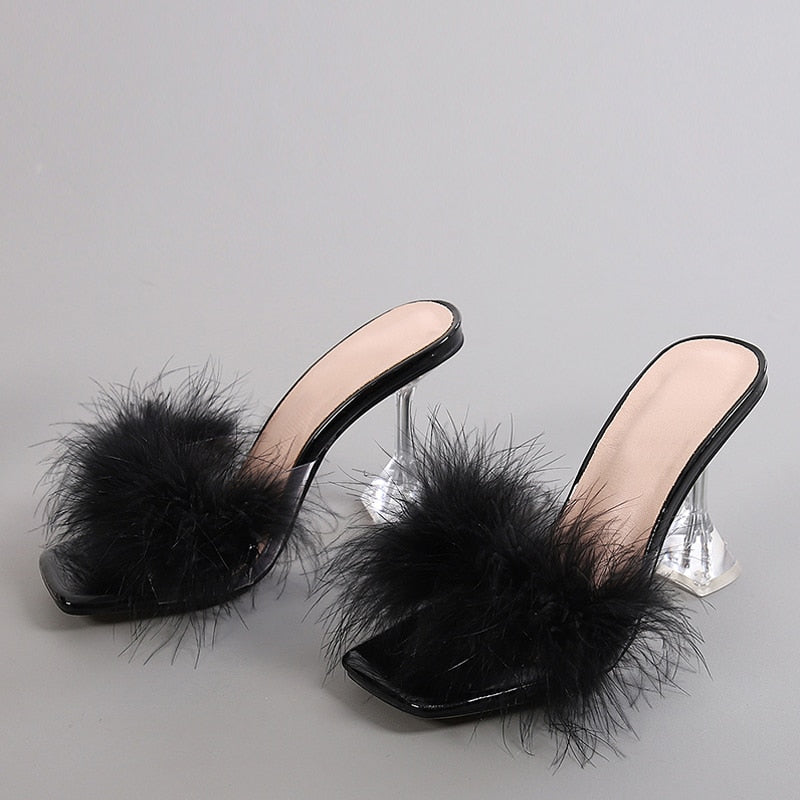 Summer Woman Pumps Transparent Perspex High Heels Fashion Color Feather Fur Peep Toe Mules Slippers Ladies Slides Shoes Sandals