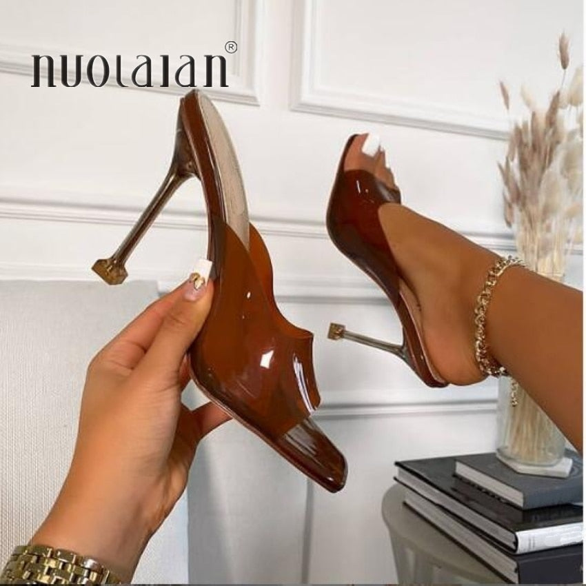 Summer Women sandals Sexy Transparent Heel Slippers Sandal Shoes Woman Thin High Heels Square Toe Sandal Lady Pump Shoes Mules