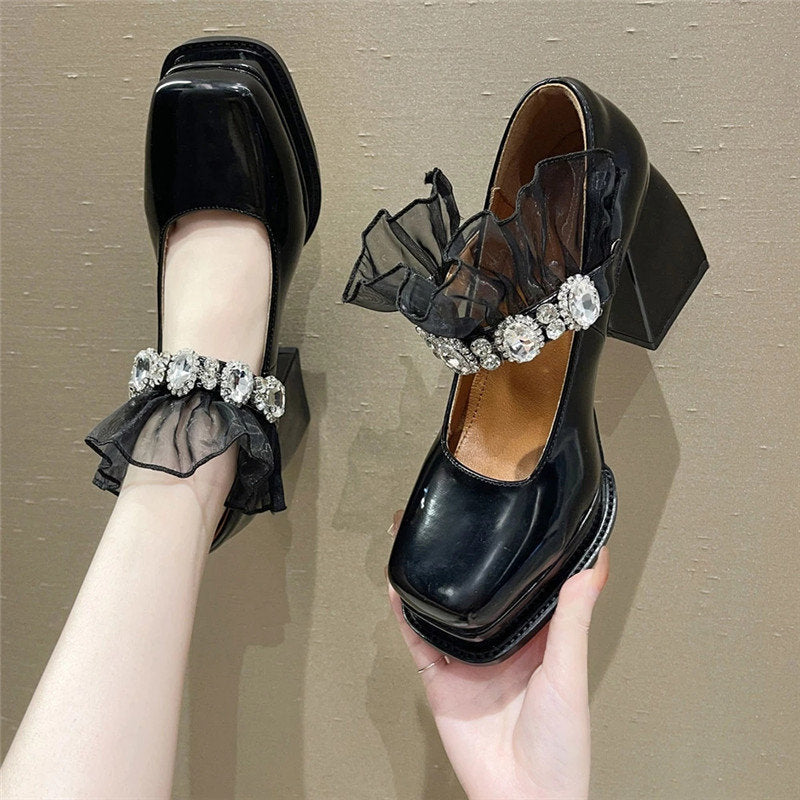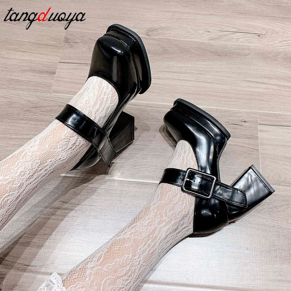 Thick Sole Mary Jane Shoes 2022 Spring Women's Square Toe Leather Shoes High Heels Velcro Wedges Party Pumps Punk Shoes