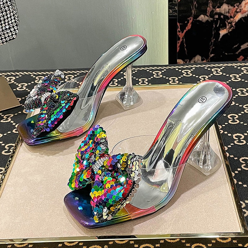 Transparent PVC Crystal Clear Heeled Women Slippers Fashion Fish Scales Bow High Heels Female Mules Slides Summer Sandals Shoes