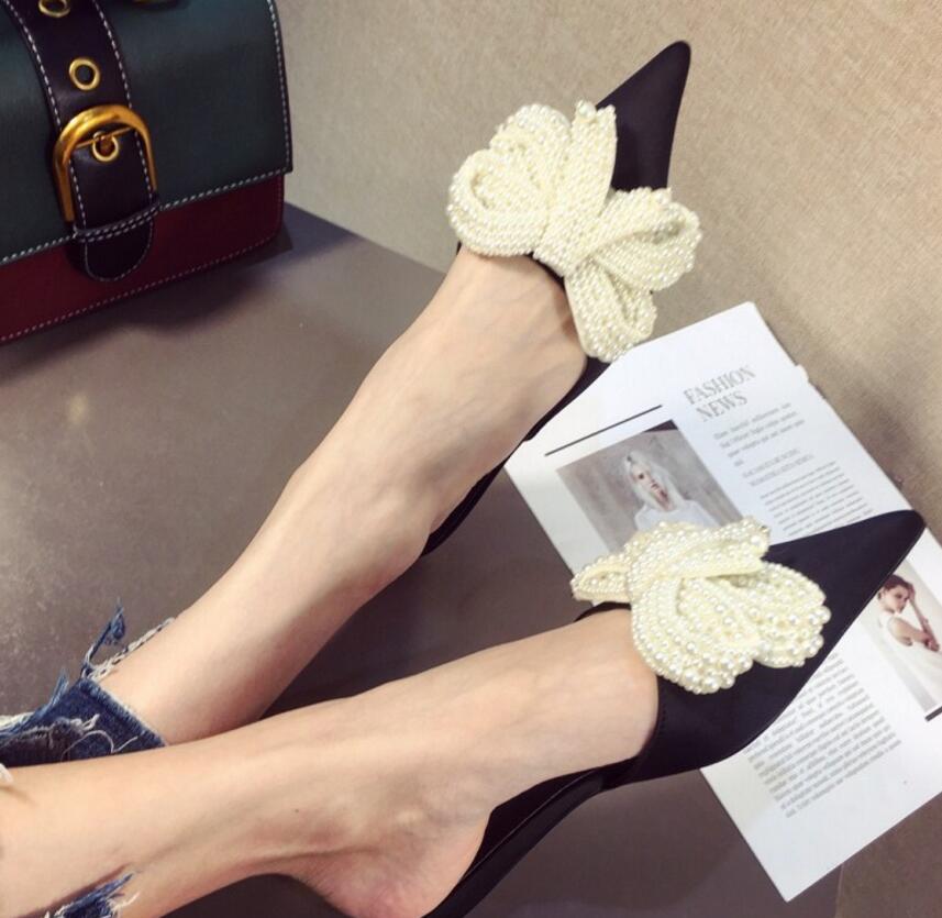 upscale big pearl bow slippers women pointed toe silk sandals beading bowtie mules shoes woman outdoor slides flip flops c647