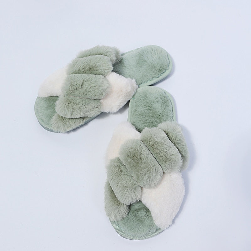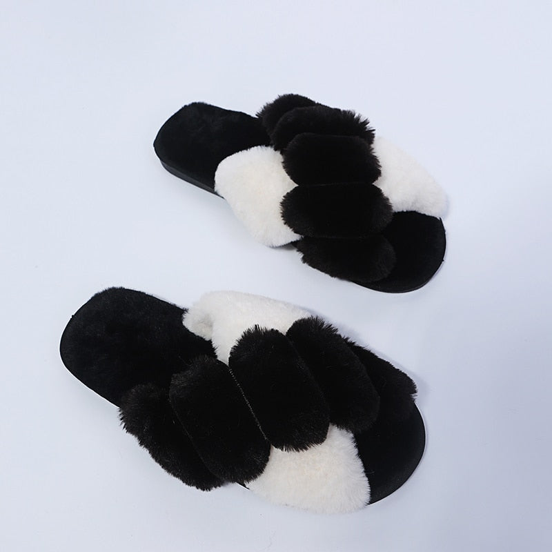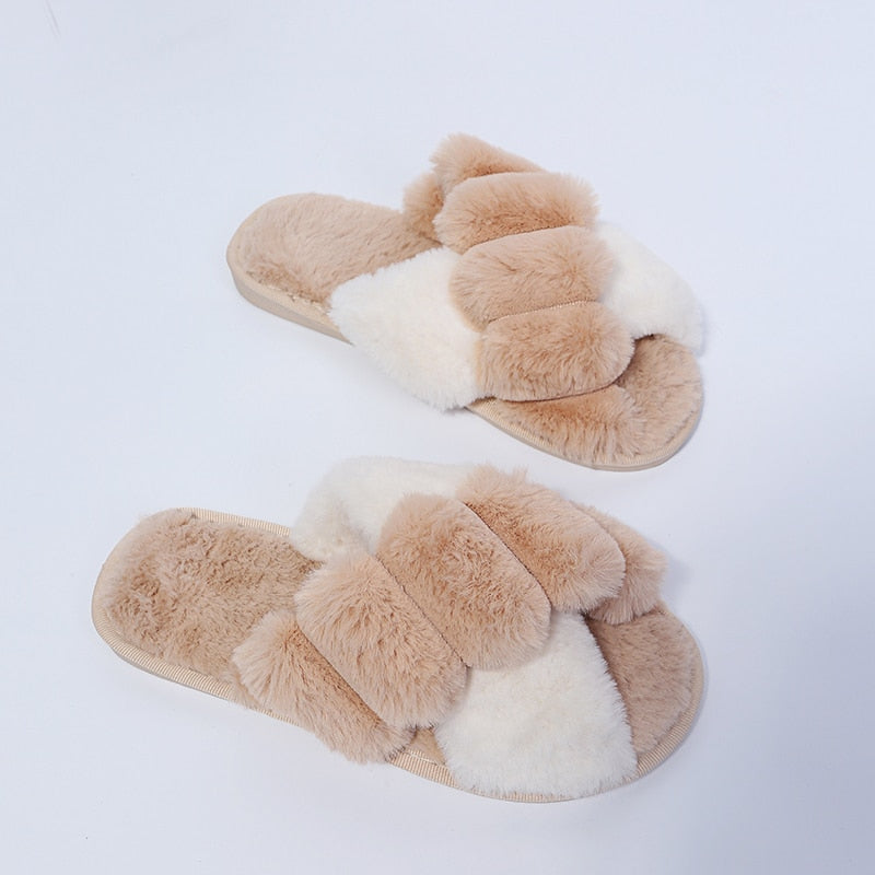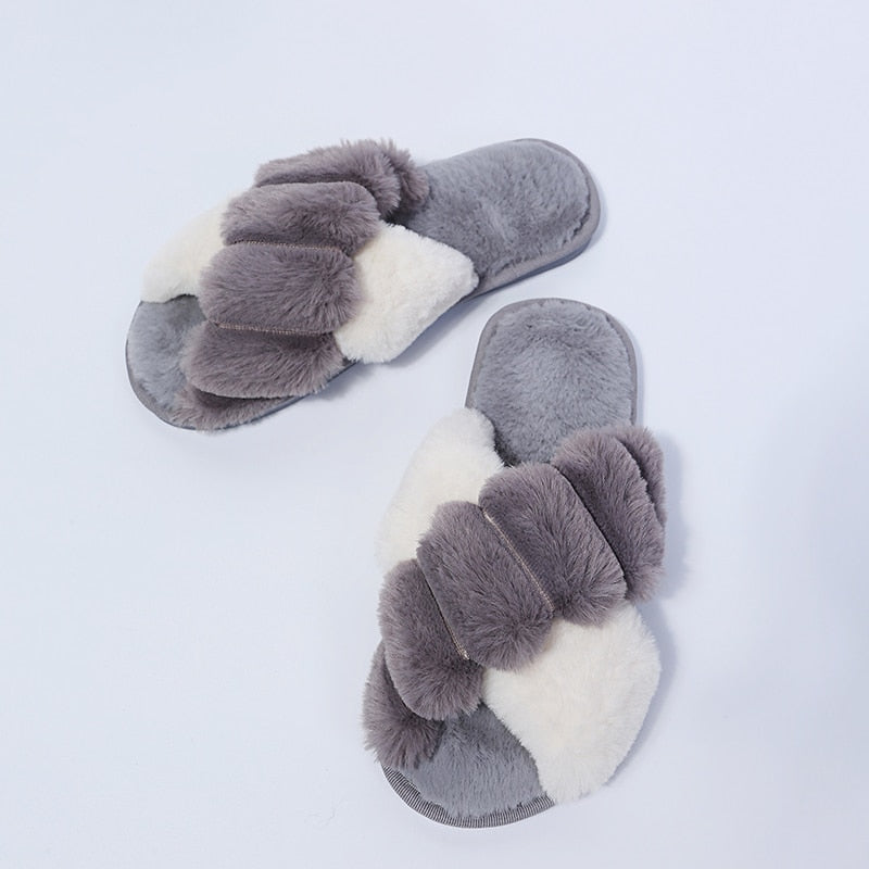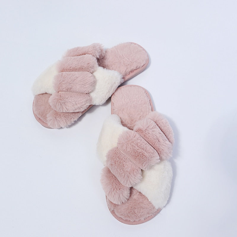 Winter Women Faux Fur Slippers Warm Fluffy Furry Cross Strap Home Indoor Shoes Footwear Cozy House Non Slip Mix Color Whosale