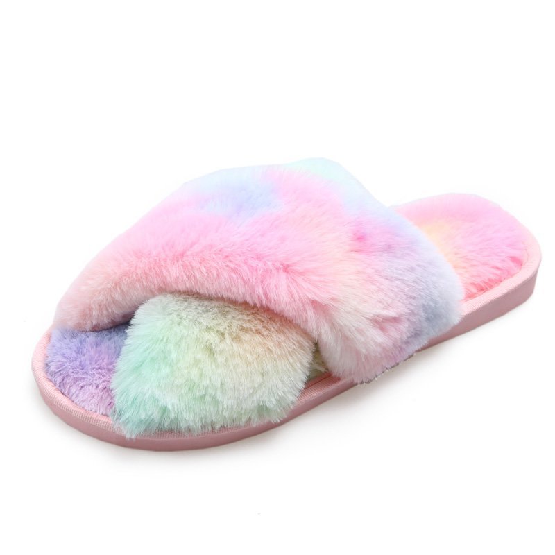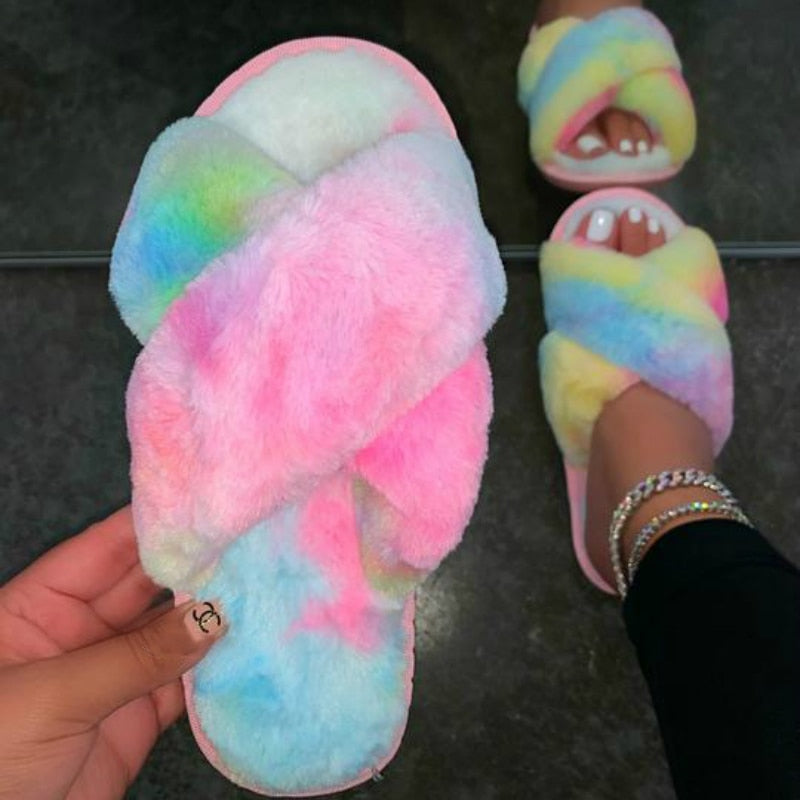 Winter Women Mix Colors Furry Slippers Flat Fluffy Soft Fur House Slides Floor Non Slip Warm Fashion Indoor Shoes Ladies Trend