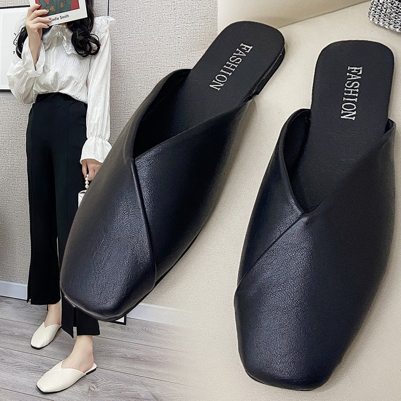 Women Mules 2021 Summer Elegant Square Closed Toe Flat Slippers Female Shoes Casual Leather Black White Slides Plus Size 35-43