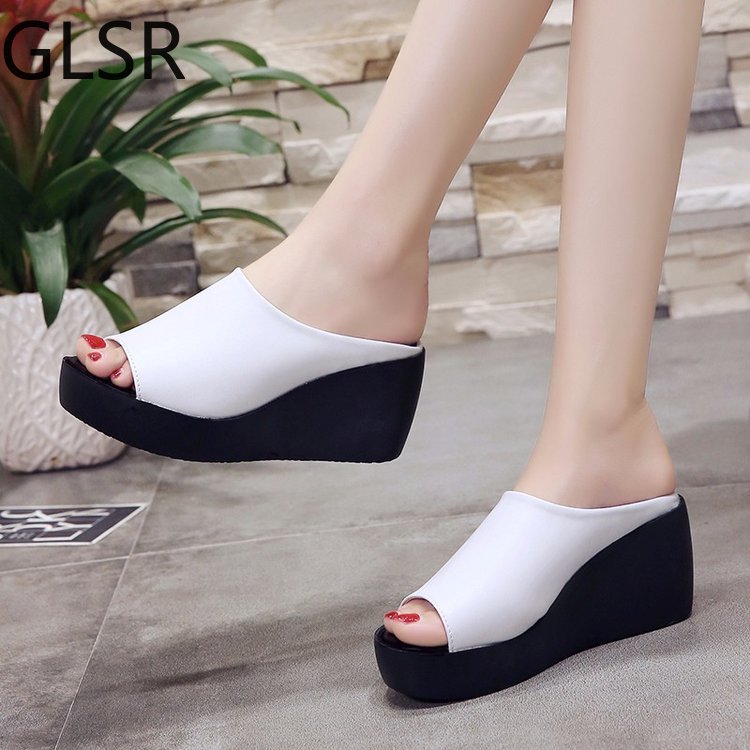 Women Sandals 7.5cm Platform Wedges Women's Shoes Thick Heel Open Peep Toe Sandals Leather Summer Style Slide Black Shoes