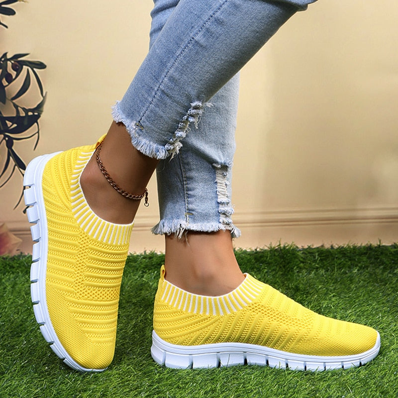 Yellow Stripe Knitted Socks Sneakers Women Spring Summer Slip On Flat Shoes Woman Plus Size Breathable Mesh Running Shoes